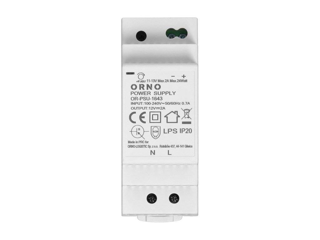 Visoko učinkovit in zanesljiv napajalnik za DIN letev z maksimalno močjo 24W. obremenitev in izhodna napetost 12V DC, ki jo je mogoče nastaviti. Razvit je bil za montažo na DIN letev in se lahko uporablja v številnih aplikacijah, npr. v industrijskih aplikacijah, nizkonapetostnih instalacijah, kot so CCTV ali alarmni sistemi. Ta napajalni adapter vsebuje: zaščito pred preobremenitvijo, zaščito pred prenapetostjo in zaščito pred udarom strele. Integrirana dioda označuje aktivacijo naprave.