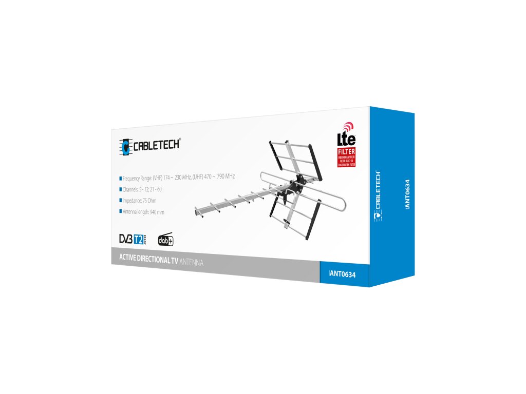 Zunanja usmerjena TV antena tipa "Yagi" Cabletech je naprava, ki omogoča sprejem zemeljske digitalne televizije DVB-T in DVB-T2 na velikih razdaljah, tudi v težkem terenu z velikimi motnjami. Antena deluje v pasu VHF 174-230 MHz ter UHF 470-790 MHz, kar zagotavlja pravilen sprejem visoko kakovostnega signala, zaradi česar lahko uživate v odlični sliki in zvoku vaših najljubših serij ali filmov.