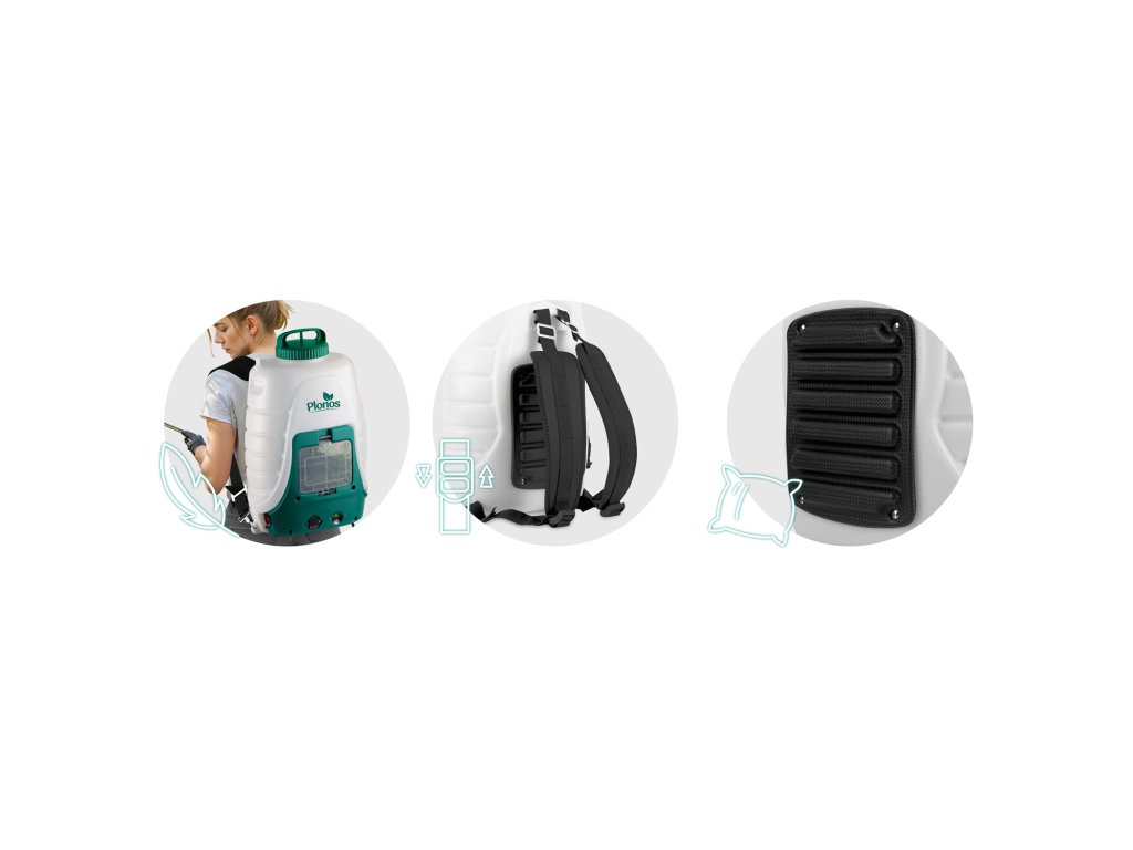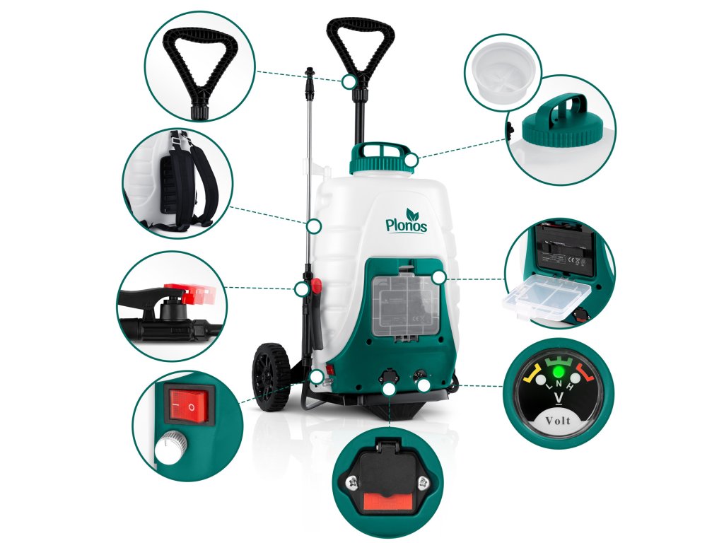 - Visoka učinkovitost in dolg čas delovanja škropilnika omogočata hitro pokritje velikih površin, kar je še posebej pomembno v večjih vrtovih.