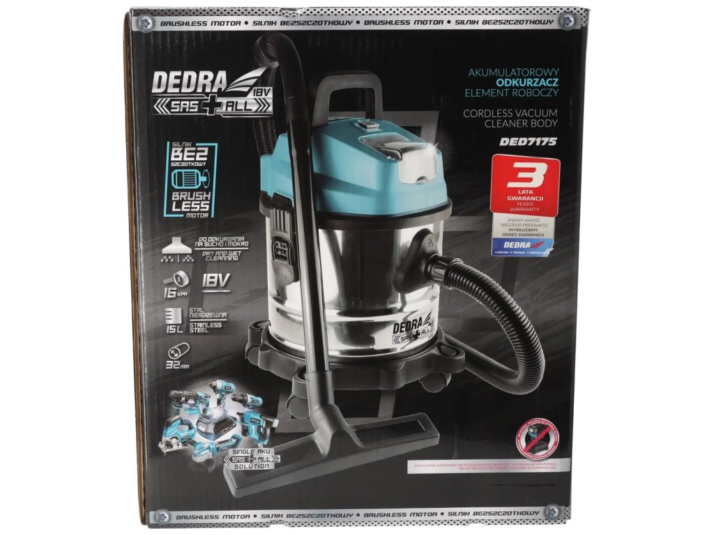 Akumulatorski sesalnik DED7175 je namenjen suhemu in mokremu delu (odsesavanje vode). Ima brezkrtačni motor, katerega prednost je, da je veliko učinkovitejši in robustnejši od tradicionalnega krtačnega motorja. Posoda ima prostornino 15 litrov in je izdelana iz nerjavečega jekla. Zahvaljujoč udobnemu ročaju in kolesom na osnovi je enostaven za uporabo in prevoz.