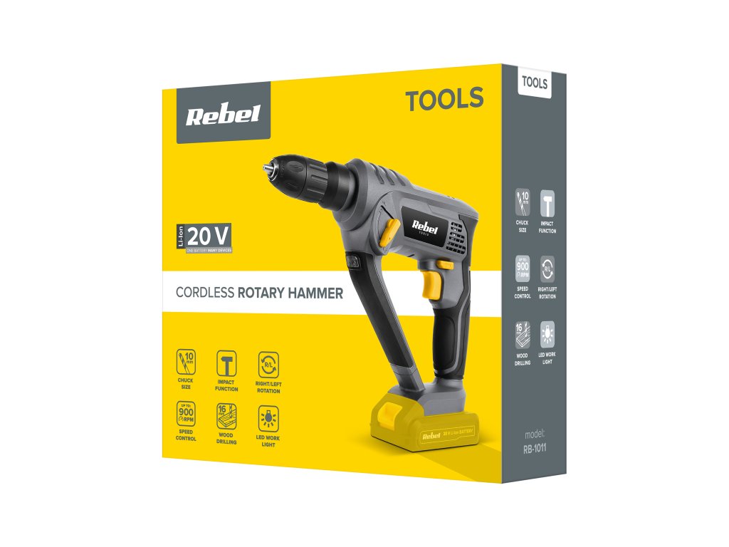 RB-1011 je akumulatorski vrtalnik in glede na vaše potrebe lahko kupite enega od dveh modelov – 2 Ah (RB-2001) ili 4 Ah (RB-2002). Prednost teh baterij je, da so univerzalne in se prilegajo večini naprav iz serije Rebel Tools.