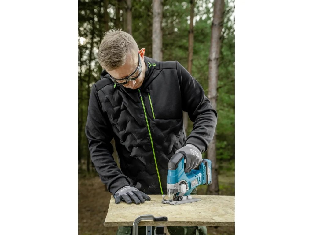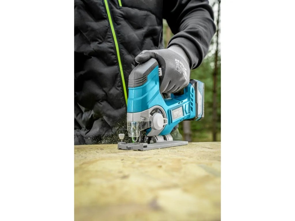 - Delovni čas pri uporabi baterije DED7032 s kapaciteto 2 Ah: 19 m rezanje 18 mm iverne plošče