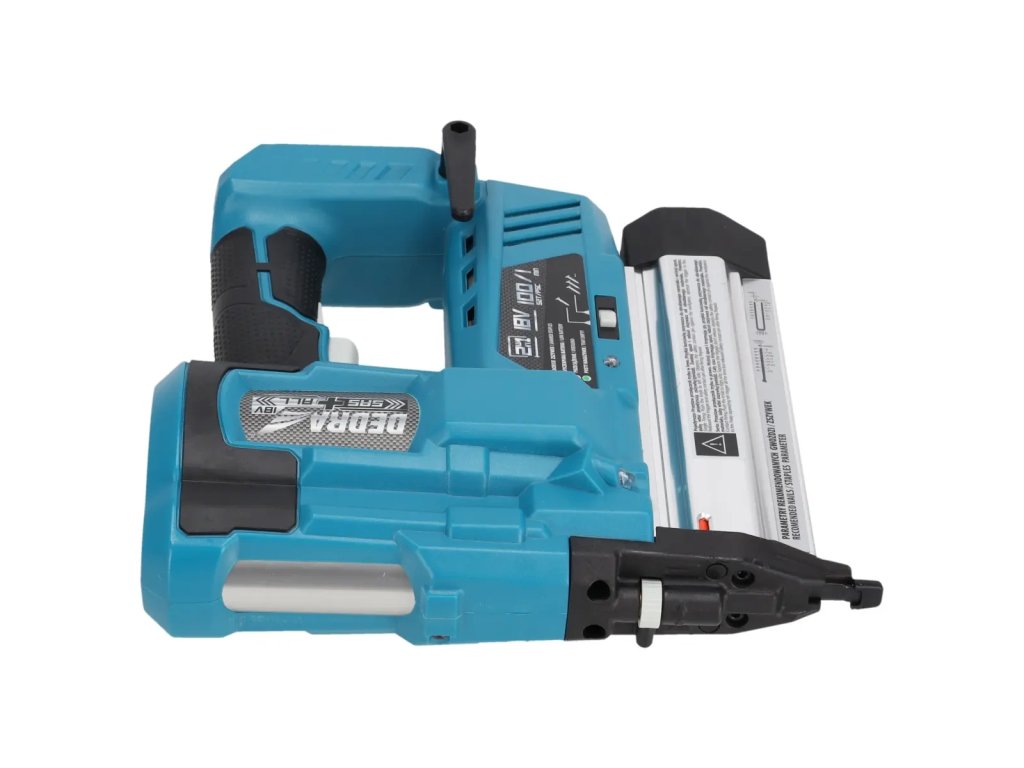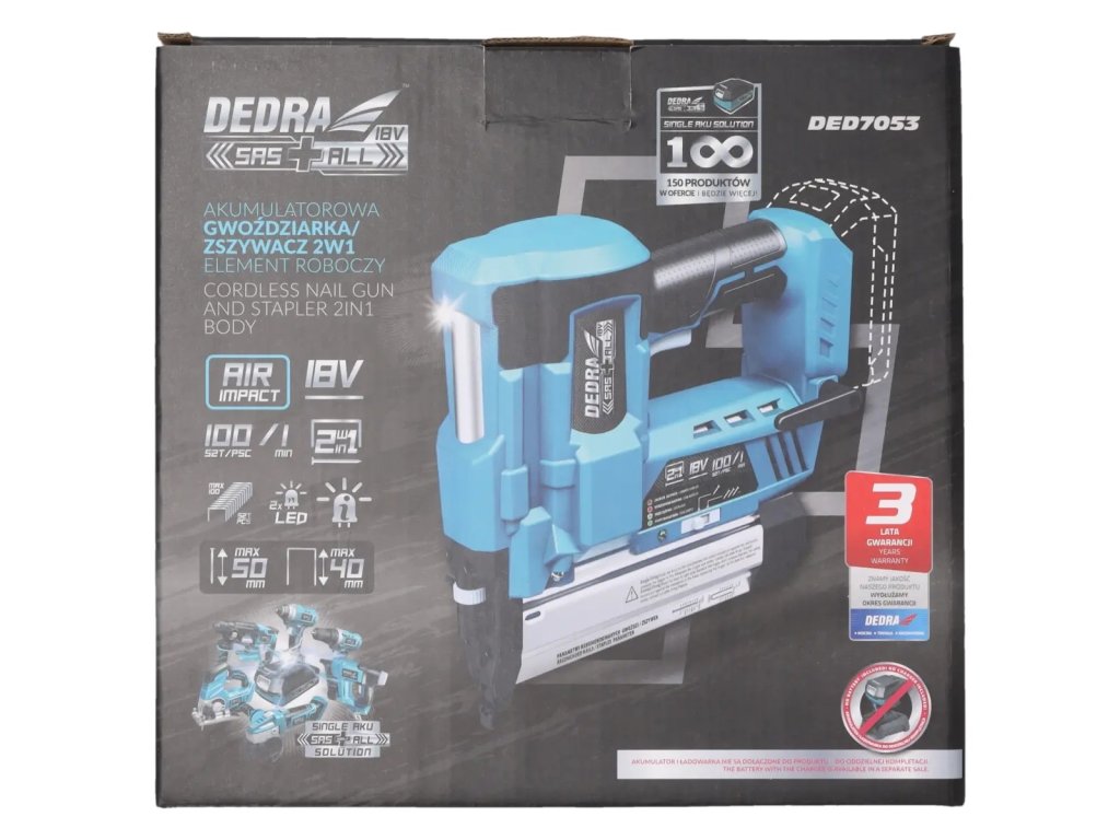 To orodje se uporablja za povezovanje različnih komponent z uporabo sponk ali žebljev. Uporablja se lahko za domača opravila, oblazinjeno pohištvo ali strešne delove. Udobno stikalo nastavlja moč zabijanja sponk in žebljev. Rezervoar vsebuje 100 sponk. Dvojna LED osvetlitev omogoča večje udobje pri delu v neosvetljenih prostorih. Stroj je opremljen z zaščito pred nenamernim zagonom. Vgrajen kompresor odpravi potrebo po zunanji povezavi stisnjenega zraka. Polnilni pnevmatski spenjač lahko vstavi sponke ali žeblje v enostavnem ali serijskem načinu. Stranski panel prikazuje: prazno kaseto, obremenitev orodja, zataknjene žeblje/sponke in prazno baterijo.