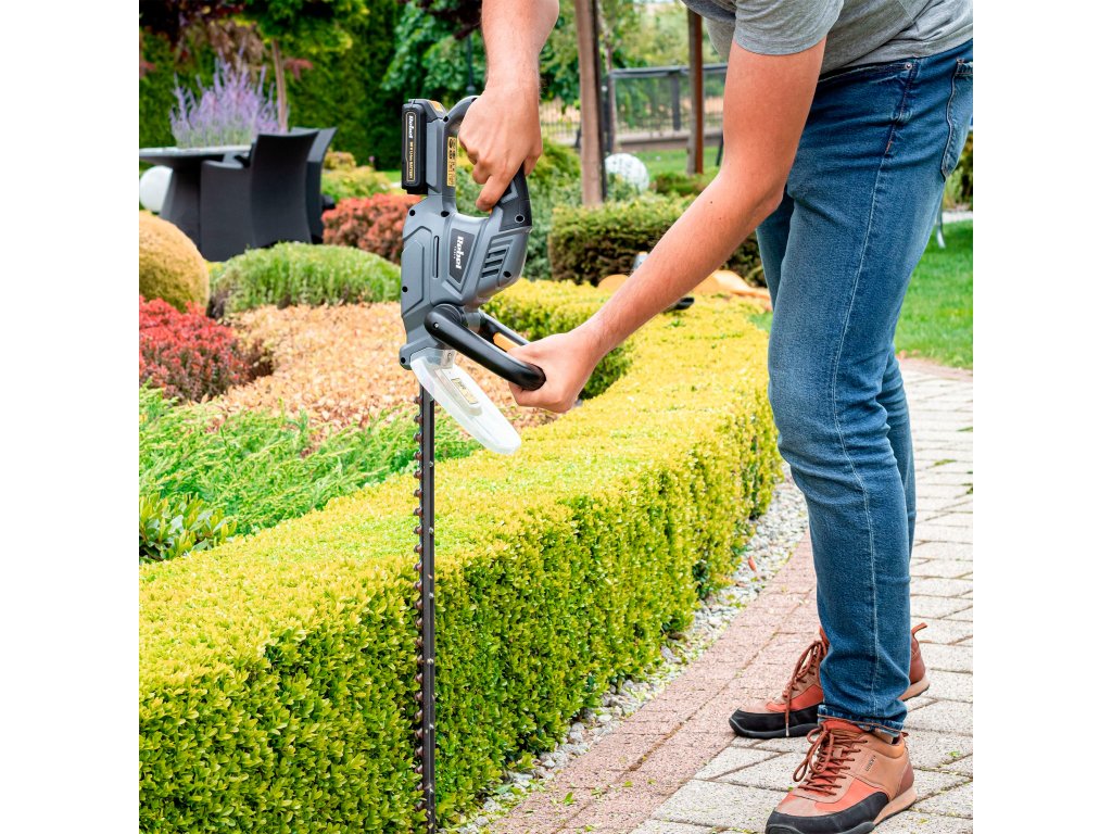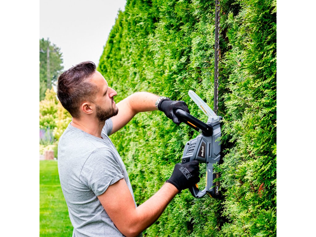 Zanesljivost in zmogljivostNapajane z Li-Ion akumulatorjem s kapaciteto 20 V in 2 Ah, škarje zagotavljajo do 30 minut neprekinjenega dela z enim polnjenjem. Hiter čas polnjenja, le 1–1,5 ure, zagotavlja, da je orodje hitro pripravljeno na ponovno uporabo. Zaradi hitrosti koraka 1400 korakov na minuto in dolžine rezila 580 mm se škarje brez težav spopadejo tudi z gostimi vejami.