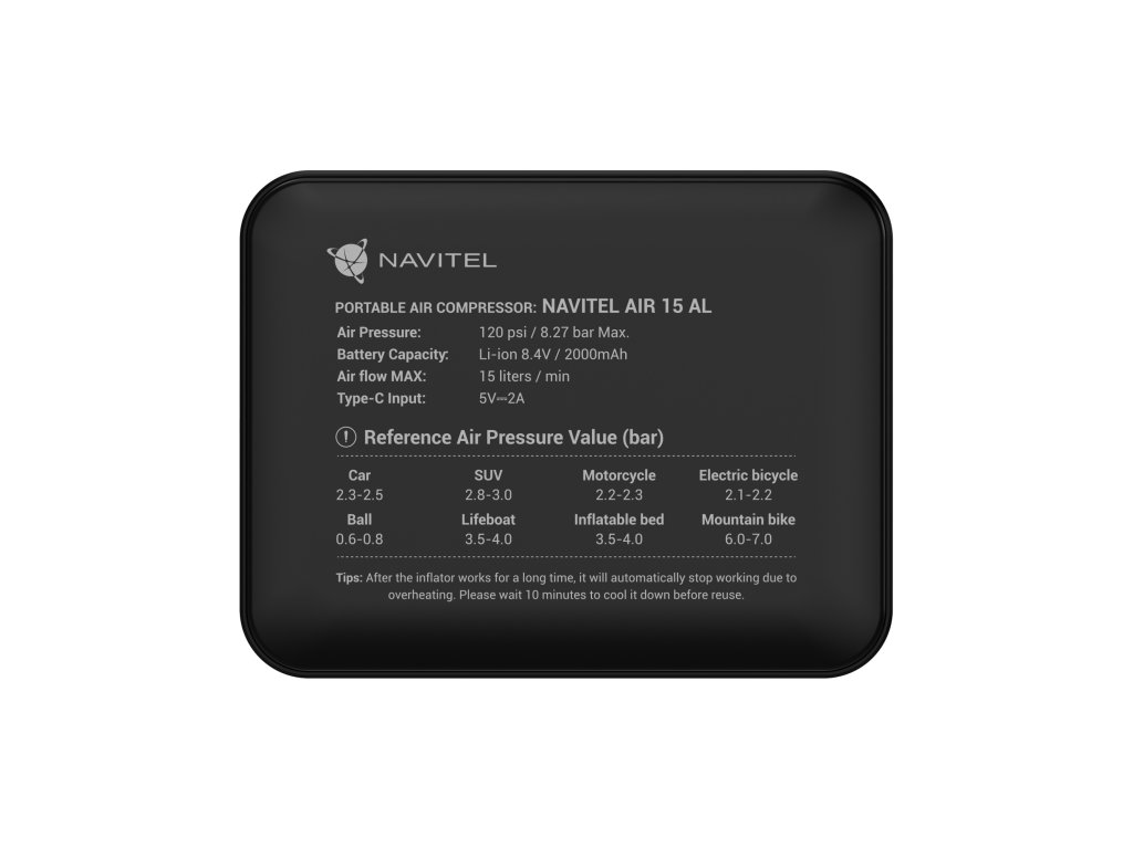 NAVITEL AIR 15 AL je akumulatorski kompresor zraka z avtomatskim regulatorjem pritiska, digitalnim manometrom in LCD zaslonom. AIR 15 AL vam omogoča enostavno napolniti avtomobilske, kolesarske in motorne pnevmatike, kroglo ali plavalne igrače. Zahvaljujoč vgrajeni Li-ion bateriji s kapaciteto 2000 mAh, kompresor deluje avtonomno - brez potrebe po priključitvi na električno vtičnico ali omrežje v vozilu.
