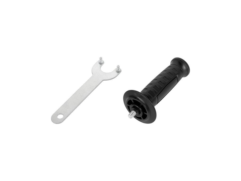 V kompletu boste našli vse, kar potrebujete za učinkovito uporabo: bočni ročaj, nastavljiv ščit diska, ključ za menjavo diska in navodila za uporabo.