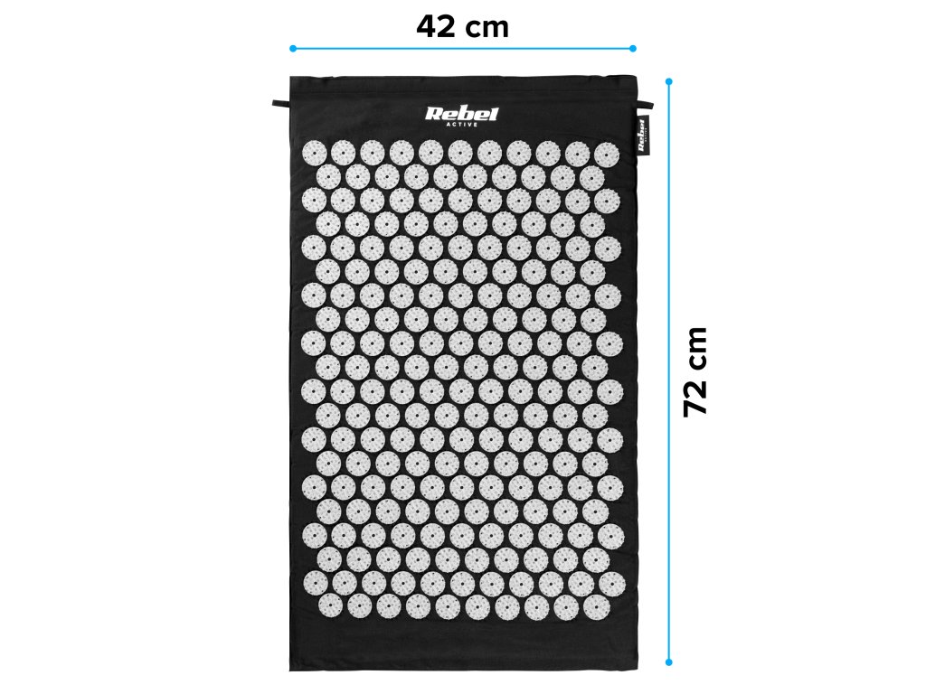 Akupresurna blazina Rebel Active ima dimenzije 72x42 cm, kar omogoča akupresurno terapijo izbranih delov telesa. Lahko jo uporabite na primer za sprostitev, zmanjšanje stresa ter lajšanje bolečin v hrbtu in vratu. Kompaktna in praktična velikost je prav tako idealna za potovanja.