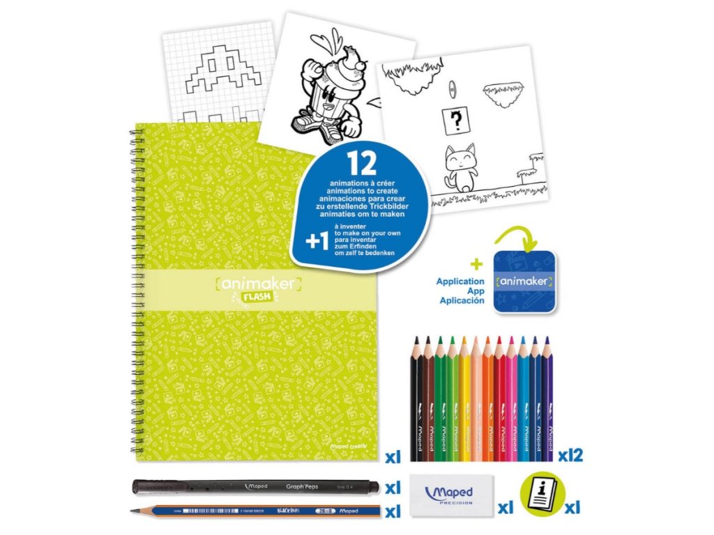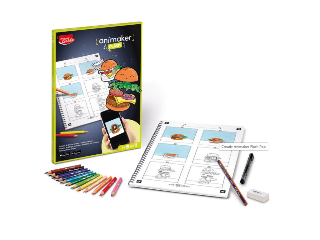 Maped Creativ ponuja komplet Animaker Flash, ki v kombinaciji z brezplačno aplikacijo omogoča snemanje 12 mini risanih zgodb na razporeditev zasnovane predloge ali po lastnem neomejenem konceptu.