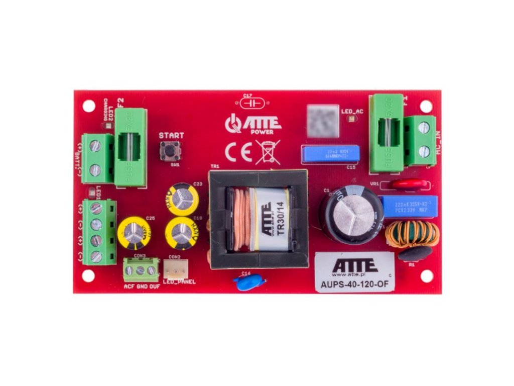 AUPS-40-120-OF ATTE je impulzni napajalni vir, ki ponuja trajno moč 42W in maksimalno 60W med polnjenjem akumulatorja. Izhodni tok naprave je 3,5A v neprekinjenem načinu, medtem ko lahko maksimalni tok med polnjenjem akumulatorja doseže vrednost 5A, kar zagotavlja zelo hitro polnjenje akumulatorja s tokom intenzivnosti do 1,5A brez prekomernega pregrevanja akumulatorja ali napajalnega vira ATTE.