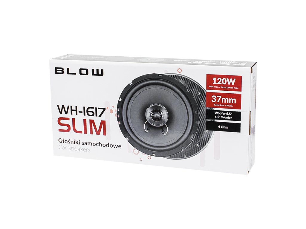 Komplet dveh univerzalnih dvosistemskih avtomobilskih zvočnikov SLIM različice znamke Blow z maksimalno močjo 120W. Zaradi visoke kakovosti izdelave in privlačne barvne sheme bi se zvočniki morali popolnoma ujeti s prostorom vsakega avtomobila. Namestite jih lahko v mnogih avtomobilih na armaturno ploščo, v vrata ali na zadnjo polico, zahvaljujoč SLIM konstrukciji pa majhna montažna globina ne bo več predstavljala problema.