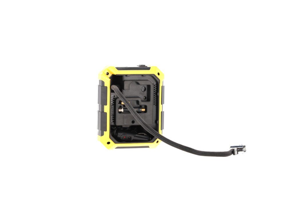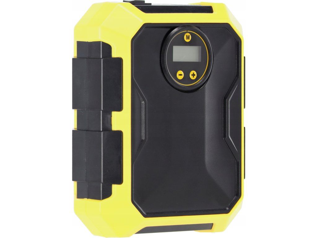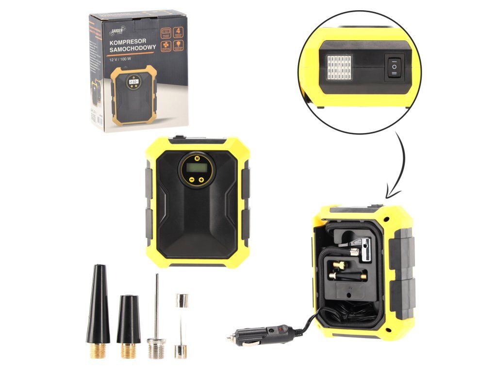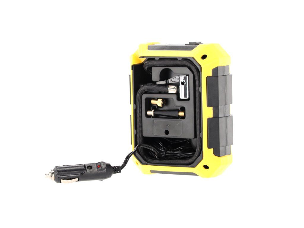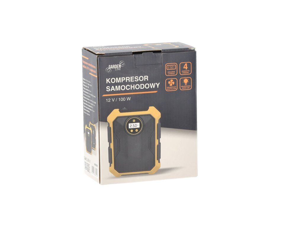 Praktičen in kompakten avtomobilski kompresor 12V z močjo 100W je nujna naprava v vsakem vozilu. Priklopljen na vtičnico vžigalnika se bo izkazal tako med vsakodnevnimi potovanji kot tudi v nujnih situacijah. Zahvaljujoč samodejnemu izklopu po dosego nastavljenega tlaka omogoča brezskrbno napolnitev pnevmatik, brez tveganja za prenapolnitev. Digitalni merilec omogoča nastavitev tlaka v 4 enotah (PSI, KPA, BAR, KG/CM2), ki se prilagaja različnim standardom in potrebam.