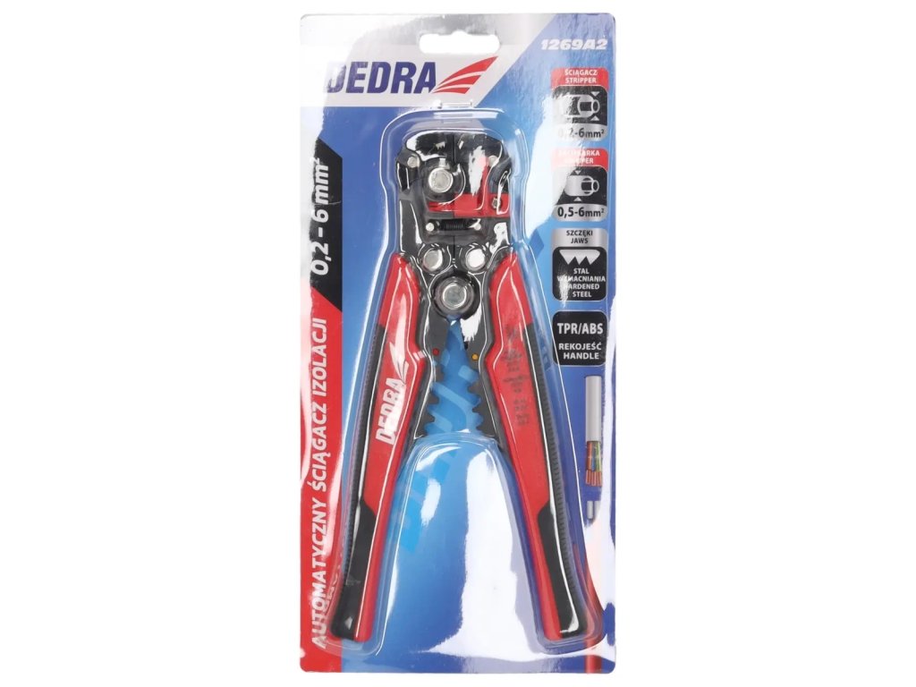 Odstranjevalec izolacije za žice DEDRA 1269A2 je izjemno preprosto orodje, s katerim hitro in natančno odstranimo izolacijo z koncev električnih žic.