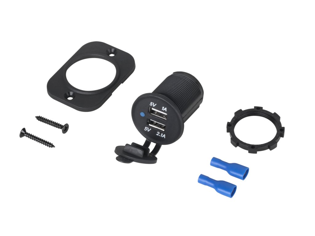 Visokokakovosten univerzalni avtomobilski polnilec, zasnovan za vgradnjo. Dvojna USB vtičnica omogoča polnjenje dveh naprav hkrati, kar rešuje težavo z uporabo kakršnihkoli razdelilnikov, na primer pri polnjenju telefona in uporabi GPS navigacije.Naprava je opremljena z modro LED diodo, ki označuje delovanje polnilca. Napravo je mogoče napajati z 12 V ali 24 V, zaradi česar je primerna za uporabo v osebnih avtomobilih, kombijih, tovornjakih, čolnih, motociklih itd.