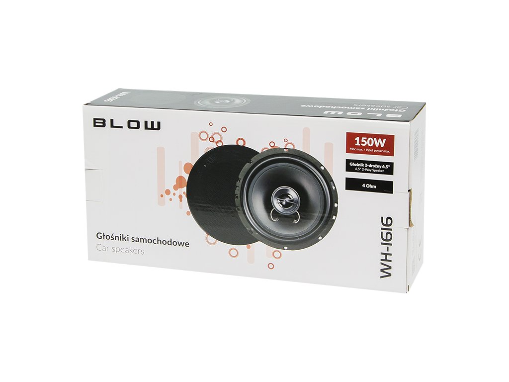 Univerzalni avtomobilski zvočniki 2-smerni 6,5" znamke Blow z največjo močjo 150 W. Zaradi visoke kakovosti izdelave in privlačne barvne sheme naj bi se zvočniki popolnoma prilegali notranjosti vsakega avtomobila. Izjemno velik premer in dobri parametri komponent zagotavljajo čist in dinamičen zvok ter širok razpon frekvenc, kar ponuja izjemne glasbene doživetje.