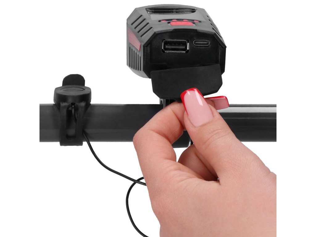 - Zadaj pod gumijastim pokrovom 2 USB vtičnici: USB-C za polnjenje luči in velika USB vtičnica za povezavo telefona