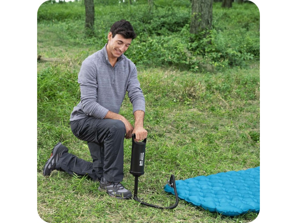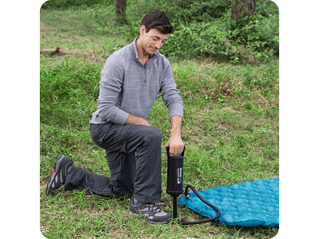 Hitro in elegantno batno črpalko, ki zaradi treh zamenljivih nastavkov ustreza večini napihljivih izdelkov, in elastična cev omogoča dostop do težko dostopnih mest. Njena dodatna prednost je možnost črpanja zraka v obe smeri - med premikanjem gor in dol. Zaradi te prednosti se čas črpanja in čakanje na pripravljenost napihljivih izdelkov za uporabo znatno skrajšata.