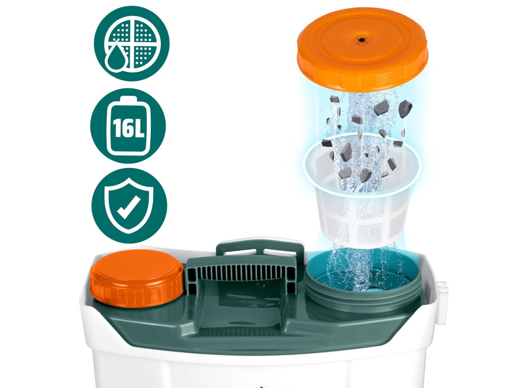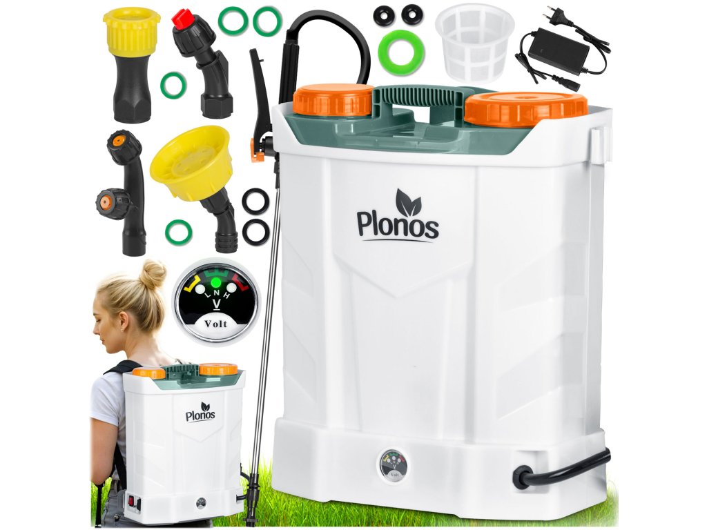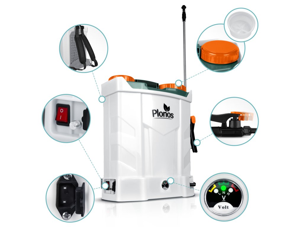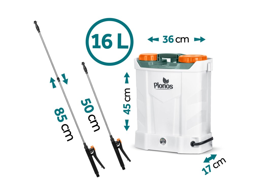 Akumulatorski škropilnik 16 l Plonos Plonos: 460200 Bučen in zdrav vrt na medaljo! ? Visoka učinkovitost in dolga delovna doba škropilnika — hitro pokrivanje tudi velikih vrtov! ? Trakovi za nošenje na hrbtu ter ročaji — olajšajo delo in zagotavljajo udobje, zaradi česar bo delo lažje in prijetnejše! ? Učinkovita zaščita pred škodljivci in boleznimi — ključ do boljšega pridelka in bolj zdravega videza rastlin. ? Certifikat CE. ? Rezervoar iz trajnega PE materiala, odpornega na kemične snovi za vrt. Popoln komplet 13 elementov ??? Poskrbi za vrt kot strokovnjak! Udobni in mehki trakovi z nastavitvijo. Sito za filtriranje nečistoč. Akumulator s polnilcem — kar 8 Ah. Diodni indikator nivoja napolnjenosti akumulatorja. Priključek za napajanje. Stikalo in gumb za uravnavanje delovanja motorja. Ročaj z zaporko — za večje udobje med daljšim delom. ? Akumulatorski škropilnik z zamenljivimi šobami za manjšo porabo kemikalij Natančno doziranje in razporejanje zaščitnih sredstev za rastline zmanjšuje njihovo porabo, kar je bolj ekološko in ekonomično. Visoka učinkovitost in dolga delovna doba škropilnika omogočata hitro pokrivanje velikih površin, kar je še posebej pomembno na večjih vrtovih. ??? 4 različne šobe za večje udobje pri delu Razpršilna šoba: odlična za nežne rastline, ki zahtevajo nežno škropljenje. Zagotavlja enakomerno razporejanje meglice. Ravna šoba: zagotavlja natančno prilagoditev curka tekočine, idealna za zahtevne naloge, kot je škropljenje sadnega drevja ali grmov. Nastavljiva štiri-luknjasta šoba: omogoča natančno prilagajanje curka tekočine za različne vrste rastlin, idealna za splošna opravila v vrtu. Šoba z dvojno glavo: zagotavlja učinkovito pokritje večjih površin, odlična za škropljenje širokih gredic, nudi dva enakomerna curka. ? Varnostni, vgrajen akumulator 12 V 8 Ah Delovna doba približno 4 ure. Enostavno polnjenje. Tih motor. ? Merilnik nivoja napolnjenosti akumulatorja Dioda signalizira nivo napolnjenosti akumulatorja. Ko je akumulator prazen, to signalizira z rdečim diodom in zvočnim signalom. ? Napajalnik AC/DC Vhod AC 220-240 V - 50 Hz. Vhod DC 12 V. ? Priključek za polnjenje je pokrit in zatesnjen. ? Preprečevanje zamašitve šob: sito učinkovito zajame nečistoče in večje delce, ki bi lahko zamašili šobe škropilnika. ? 16 litrov prostornine: večji rezervoar je še posebej koristen na velikih vrtovih ali na poljih. ? Lahka konstrukcija — lahko ga dvignete in namestite na hrbet. ? Debeli, ojačani trakovi z nastavljanjem — prilagodite jih svojim potrebam ali jih odstranite. Pritrditev s karabini. ? Dodatna ledvena blazina za večjo udobnost. ? Pripravite se na preobrazbo svojega vrta! Specifikacija: dimenzije: 45 x 36 x 17 cm, material: PE (polietilen), akumulator: svinčeni, 12 V, 8 Ah, maksimalni tlak: 5,5 bara, maksimalni pretok: 3,1 l/min dolžina lanske: do 85 cm, kapaciteta: 16 l, čas delovanja: 3-4 ure, teža škropilnika 6 kg. ? Uživajte v zdravem in zelenem vrtu skozi celo sezono z uveljavljeno znamko škropilnika Plonos!Dodatni parametri