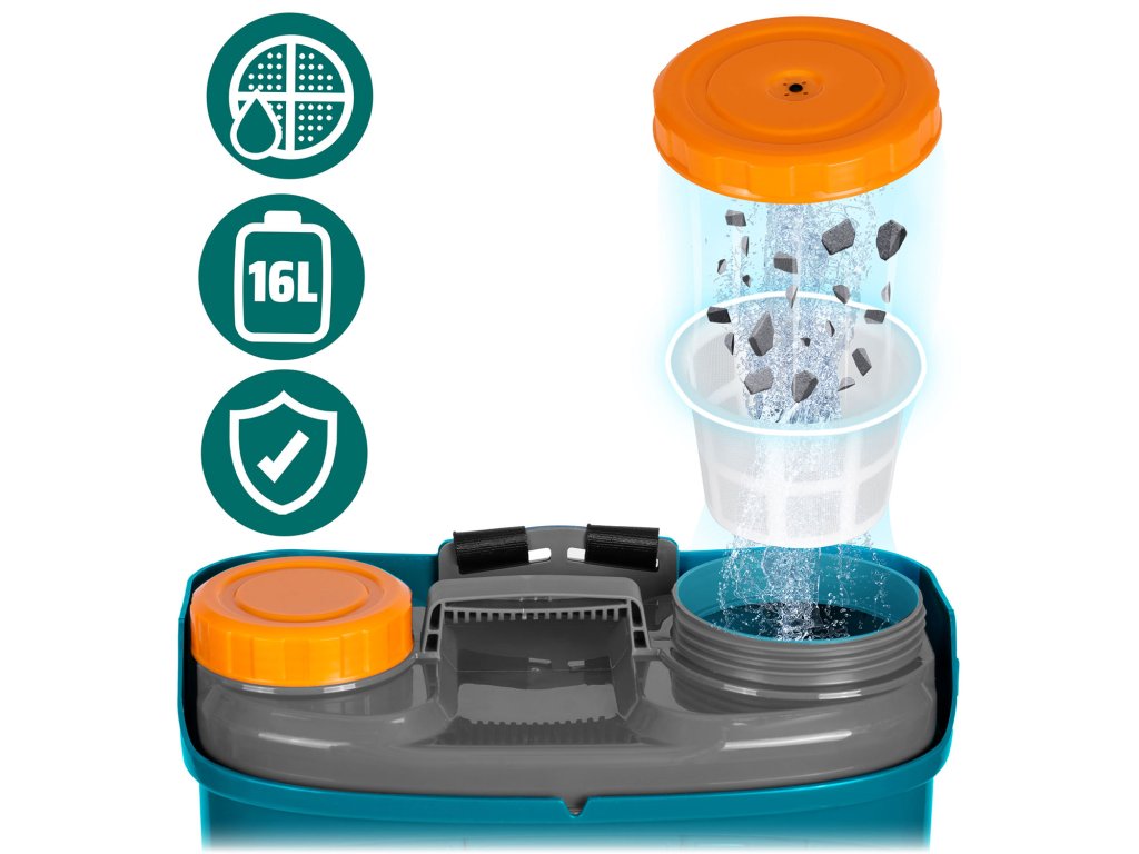 16 litrov kapacitete: večji rezervoar je še posebej uporaben v velikih vrtovih ali na poljih.