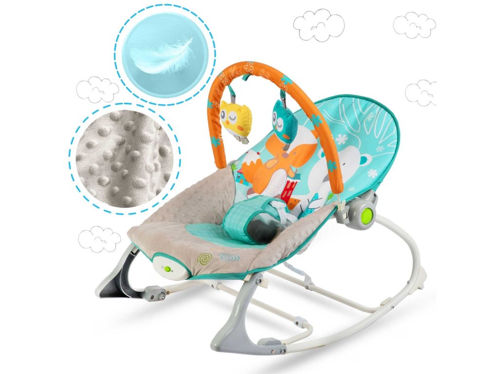 Ležalnik za dojenčke je opremljen z odstranljivim trakom s pritrjenimi šumečimi igračami - sovo in volkom ter ropotuljico. Zamotijo vašega otroka, medtem ko se lahko vi sprostite. Te edinstvene igrače spodbujajo vid inrazvijajo dotik.