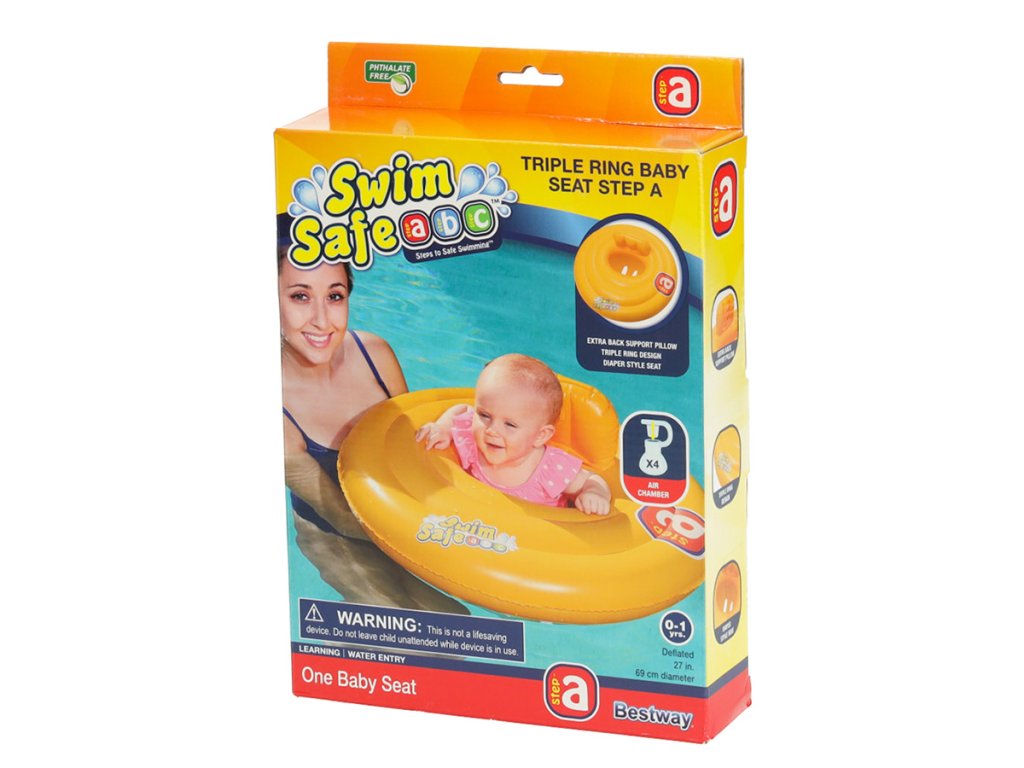 Swim Safe ABC je posebna serija izdelkov, razvitih za najmlajše otroke. Skrbnost, natančnost in visoka kakovost uporabljenih komponent so glavne značilnosti tega izdelka. Napihljiv obroč za malčke je sestavljen iz štirih napihljivih obročev. Vsak od njih ima varnostni ventil, ki preprečuje uhajanje zraka. Rebraste stranice zagotavljajo udobje na sedežu. Majhna teža in velikost kolesa omogočata, da ga vzamete na katerokoli potovanje in vaš otrok se bo med igro počutil varno.