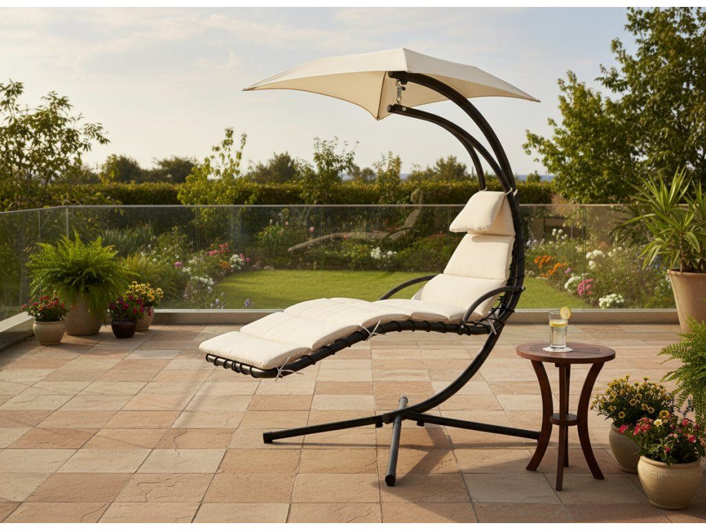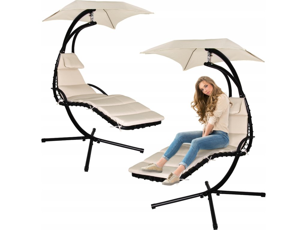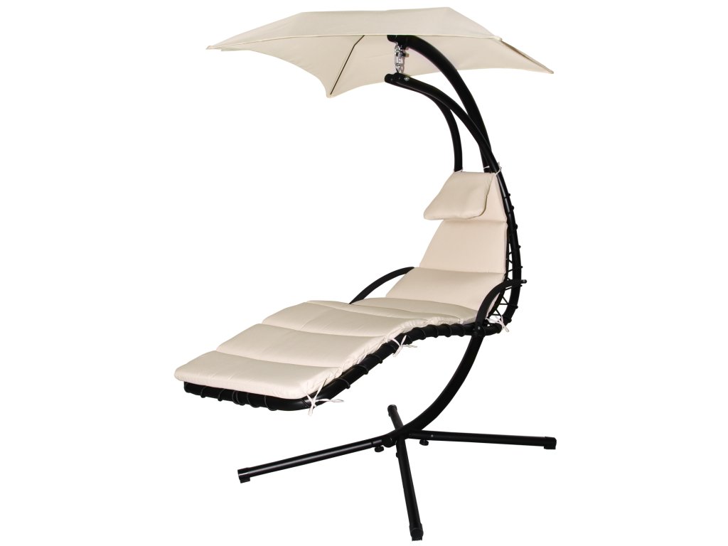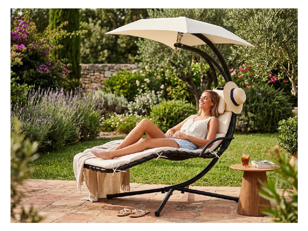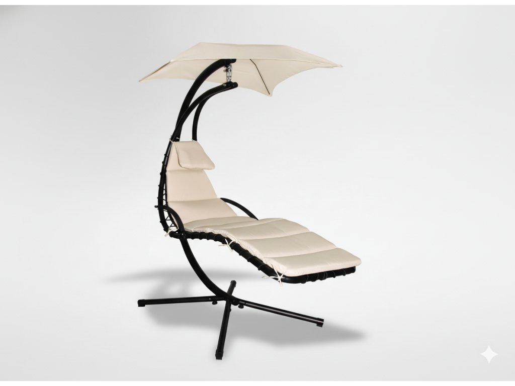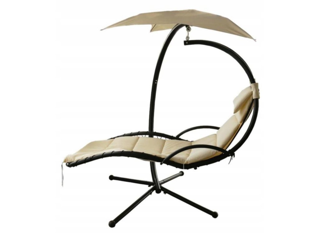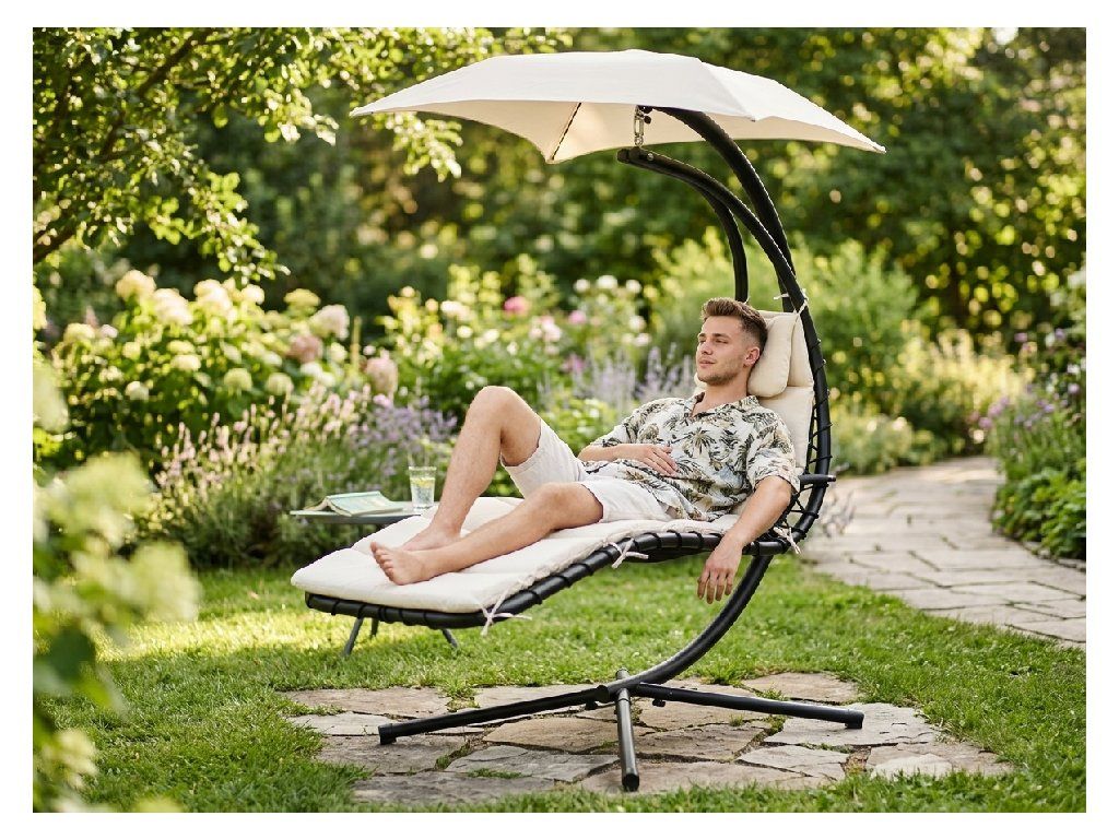 Sedežni del, izdelan iz debele mreže, nudi izjemno udobje. Mehka blazina in nadstrešek, ki ščiti pred soncem, zagotavljata, da je sprostitev na svežem zraku še prijetnejša.