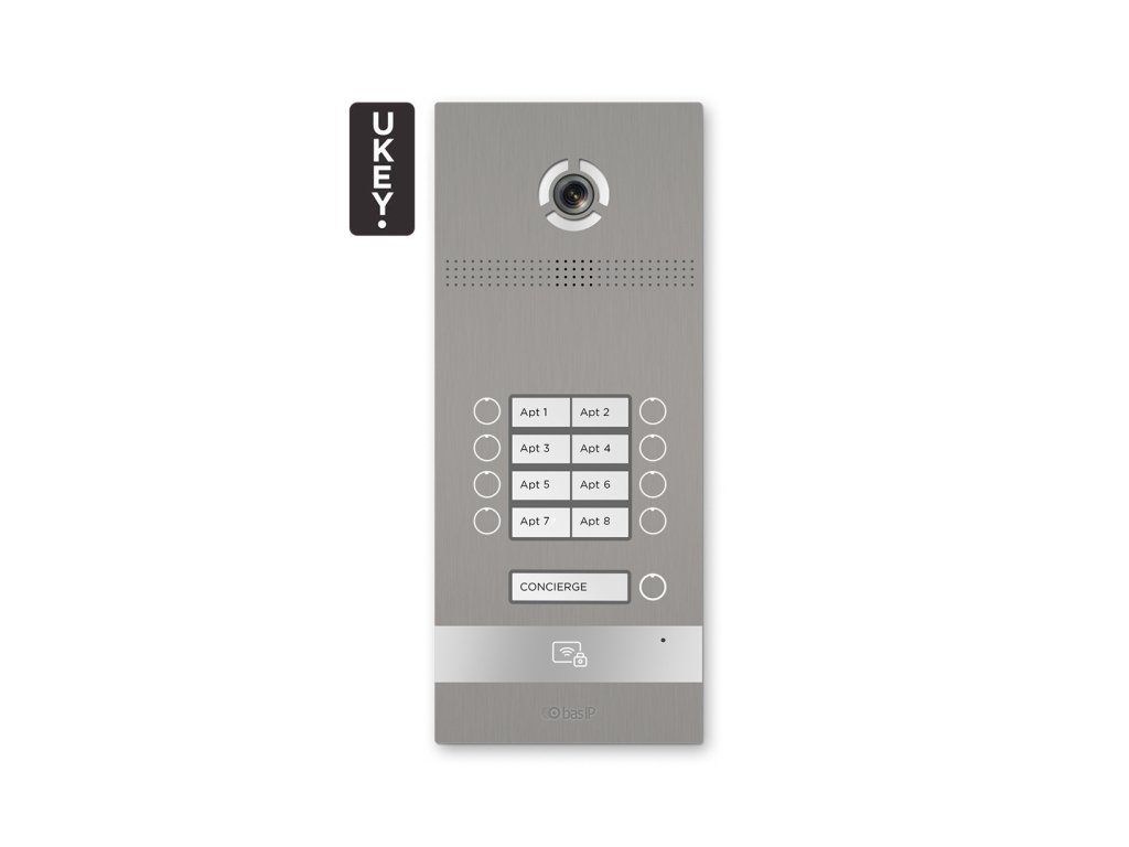 BI-08FB Srebrna enota blagovne znamke BasIP je namenjena za IP video domofone. Enota ima 8 gumbov za uporabnike in 1 gumb tipa "Concierge". BI-08FB se ponaša z modernim dizajnom in široko funkcionalnostjo; opremljena je s čitalnikom v tehnologijah Mifare in Unique ter je popolnoma integrirana s sistemom odpiranja UKEY (QR-koda, NFC in Bluetooth BLE). Naprava je sposobna popolne integracije z vsakim sistemom varnosti in avtomatizacije preko odprtega API vmesnika.