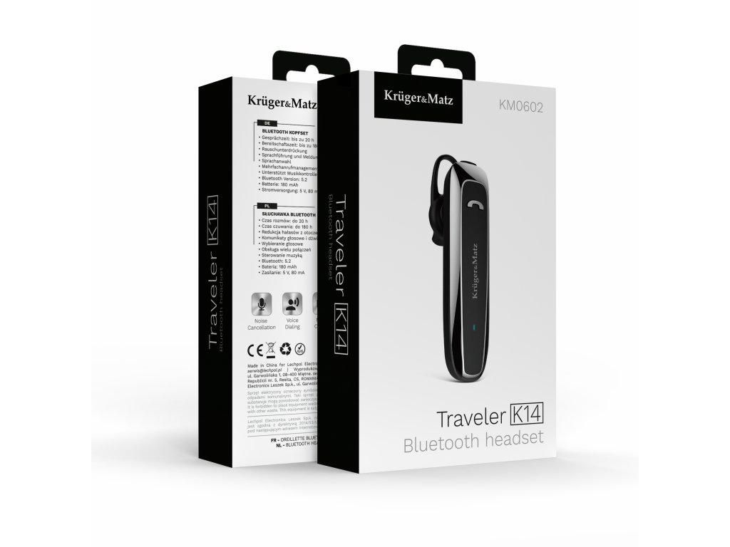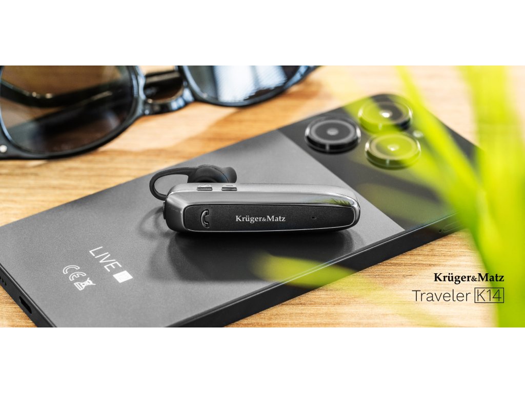 Bluetooth slušalka Kruger&Matz Traveler K14 je zanesljivo orodje za aktivne uporabnike, ki cenijo udobje, mobilnost in visoko kakovost pogovorov. Opremljena s tehnologijo Bluetooth 5.2 in funkcijo Multipoint omogoča hkratno povezavo z dvema napravama. Zaradi zmanjšanja hrupa, dolgega časa delovanja in ergonomičnega pritrjevanja deluje odlično v vsaki situaciji – tako v pisarni kot na potovanju.