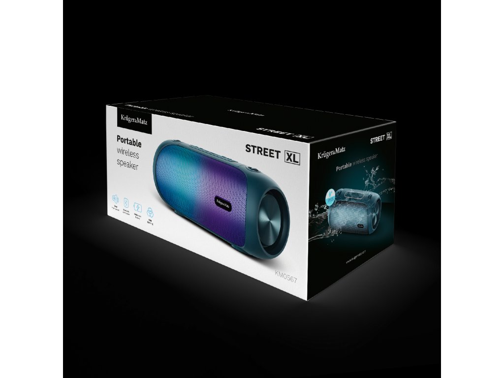 Brezžični zvočnik Street XL je opremljen z efektnim RGB osvetljenjem, ki ustvari neverjetno atmosfero in obogati glasbene izkušnje. Hitro spremembo svetlobnih učinkov lahko izvedeš s pomočjo tipke na nadzorni plošči.