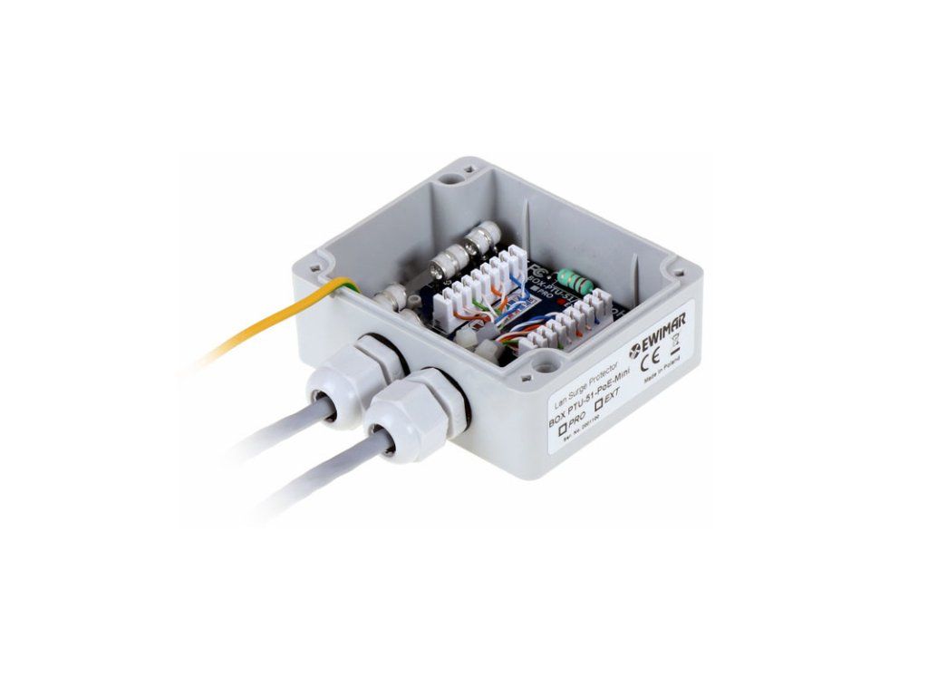 BOX PTU-51-EXT/PoE/MIN je enokančni modul odgovoren za prenapetostno zaščito za IP kamere, LAN stikala, usmerjevalnike, WiFi dostopne točke in druga naprave, ki delujejo v 100Mbit omrežjih. Naprava je združljiva s kabli UTP in FTP kategorije 5 in 6. Učinkovitost zaščite je 4-5kA @ 8/20S individualno za vsako žico (odvisno od njihove debeline). Ta zaščita ščiti zaključne naprave LAN nameščene na stebrih ali kovinskih konstrukcijah pred učinki atmosferskih izbojev, prenapetostmi, sabotiranjem in razlikami potencialov. Zaslonilni vodič odvaja v zemljo napetostne in tokovne udarce, ki izvirajo iz prehodov iskrice. Naprava ima vgrajeno MOSFET zaščito, ki povečujejo zaščitno učinkovitost in zmanjšuje izravnalne tokove med ozemljenji CCTV namestitev.