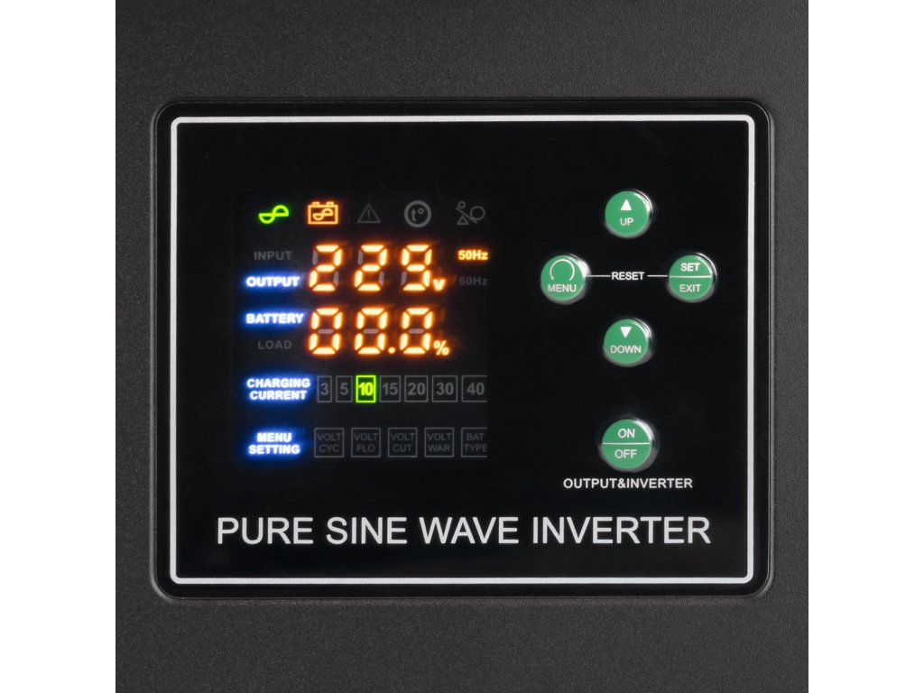 Udobna uporaba zasilnega napajalnika Rebel zagotavlja berljiv LED zaslon. Zaradi njega lahko zlahka preberete trenutni status delovanja naprave, preverite npr. raven vhodne, izhodne napetosti in frekvence. Poleg tega lahko hitro preverite raven obremenitve in stanje napolnjenosti baterije.