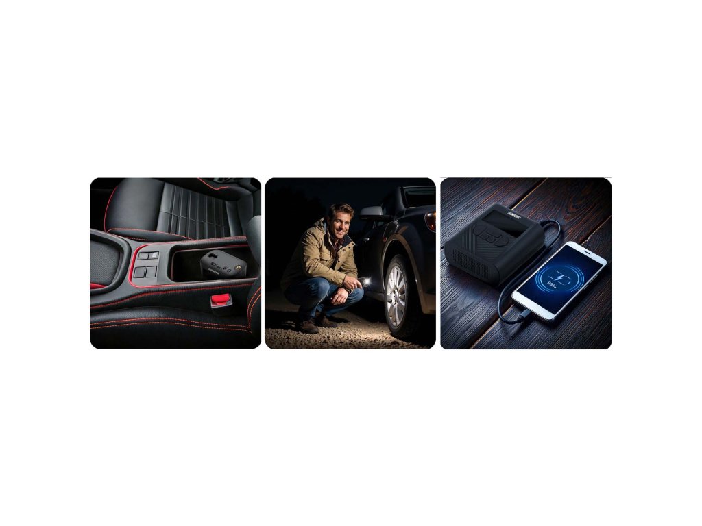 - Mini kompresor zaradi svojih majhnih dimenzij prilega v vsak avtomobilski predal, torbico, nahrbtnik. Poleg tega vgrajena luč nudi zanesljivo pomoč po temi.