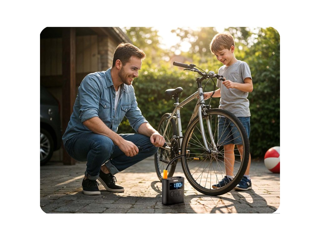- Mini kompresor je močna sila zaprta v kompaktnem ohišju. Enostavno napihne avtomobilske, motoristične in kolesarske pnevmatike in zahvaljujoč vgrajenemu senzorju tlaka se samodejno izklopi po doseganju nastavljene vrednosti.
