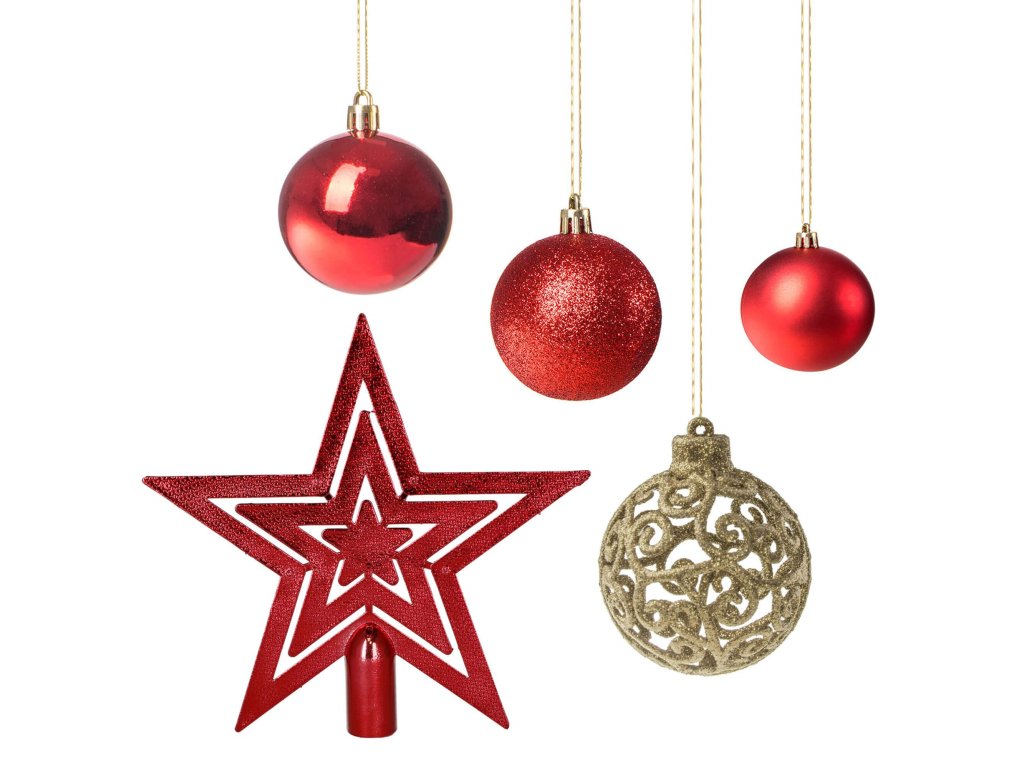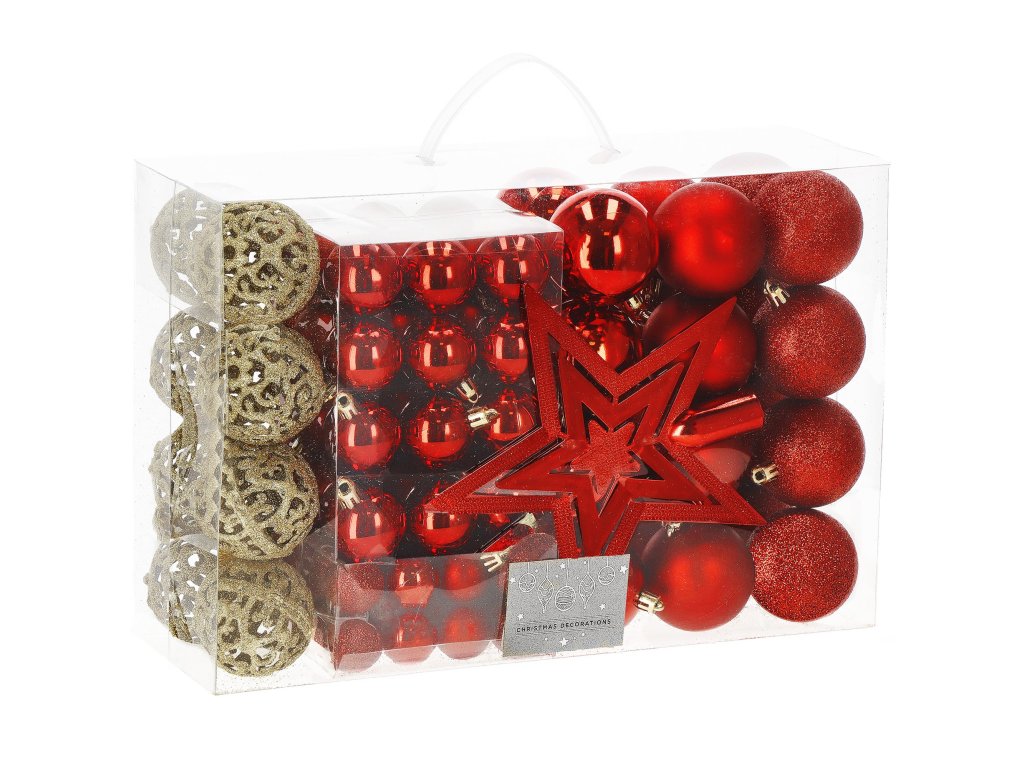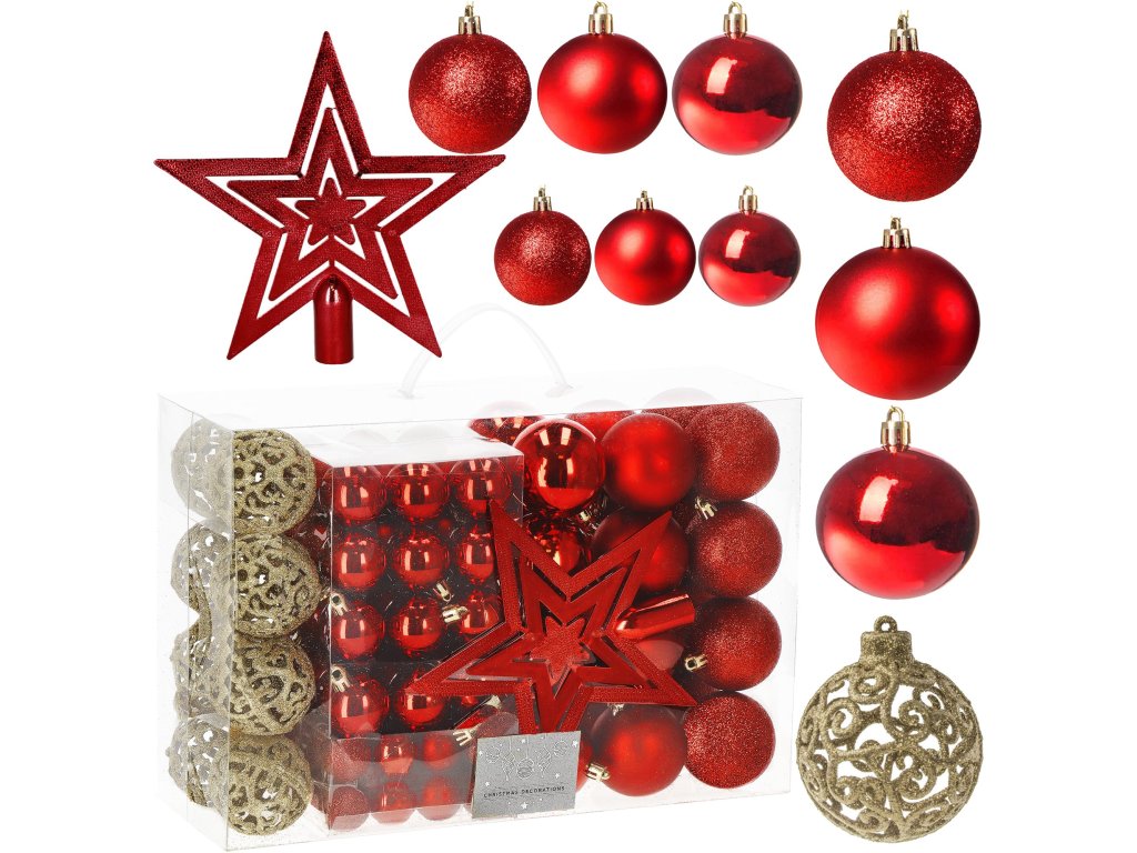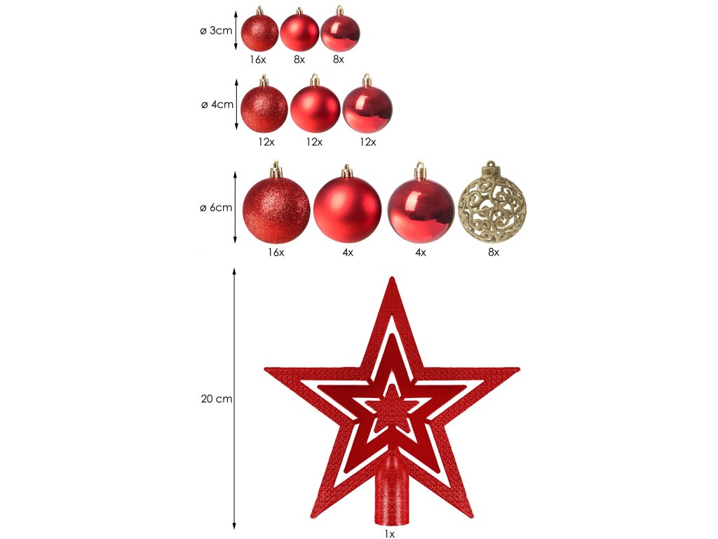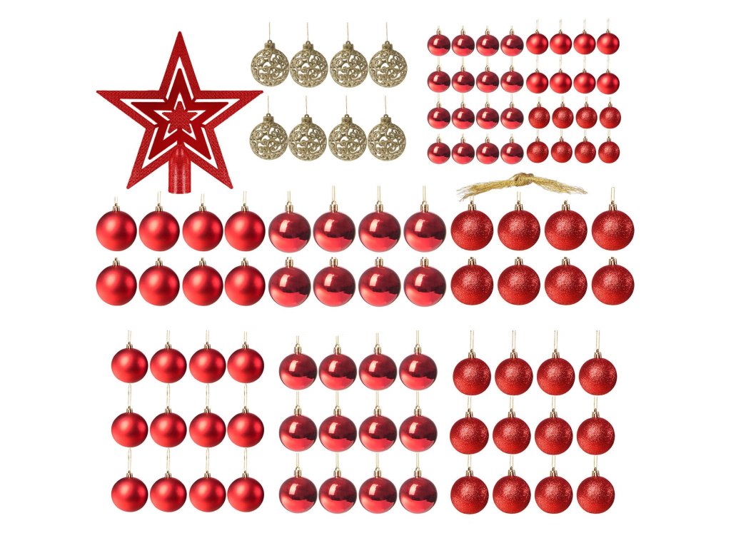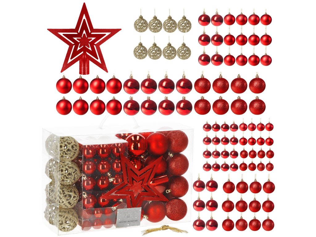 - Količina: 100 kosov okraskov + 1 zvezda za vrh drevesa