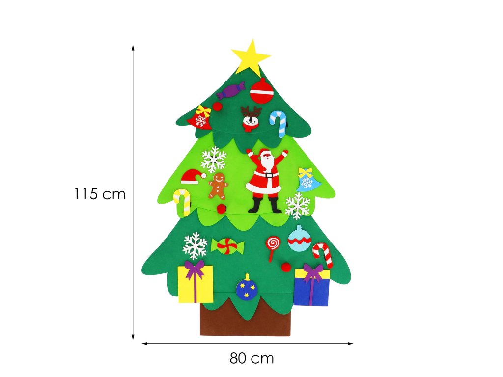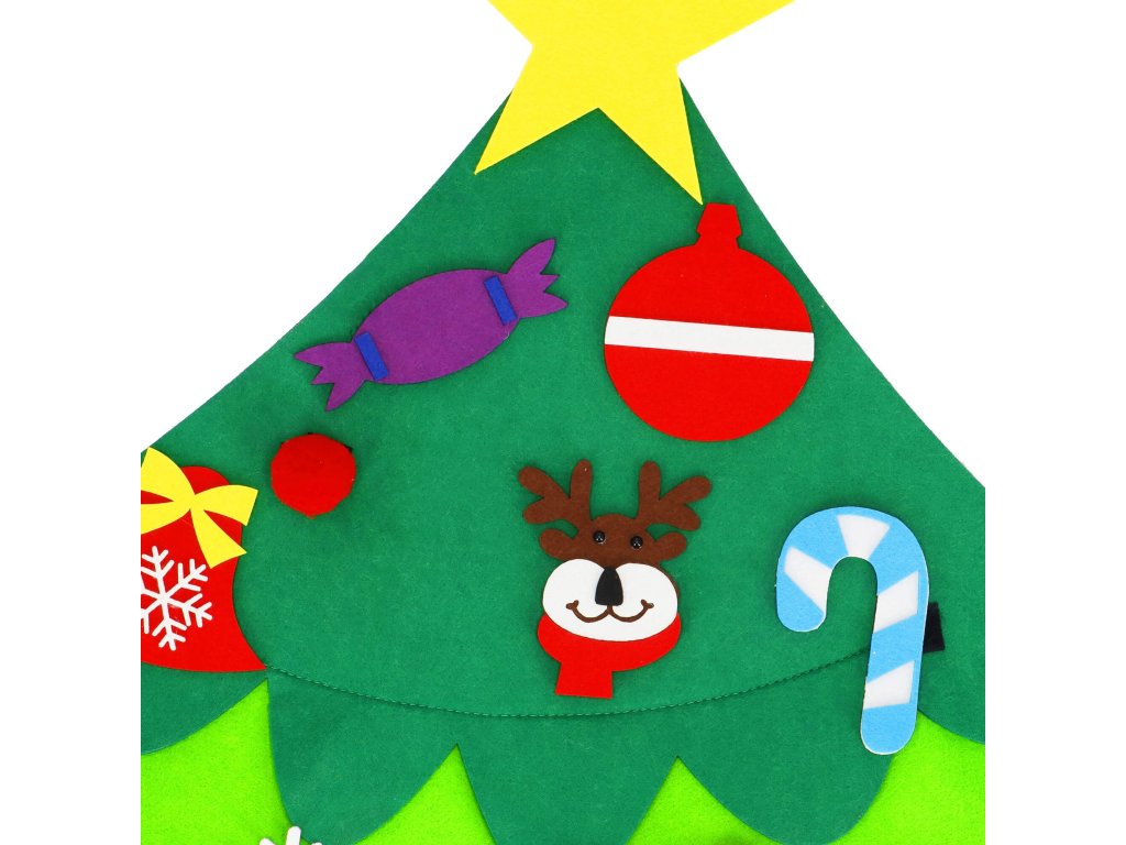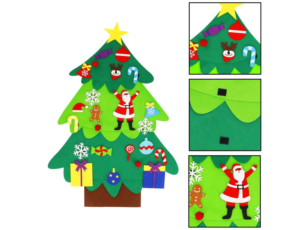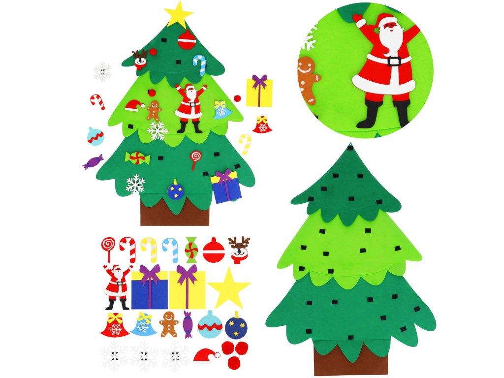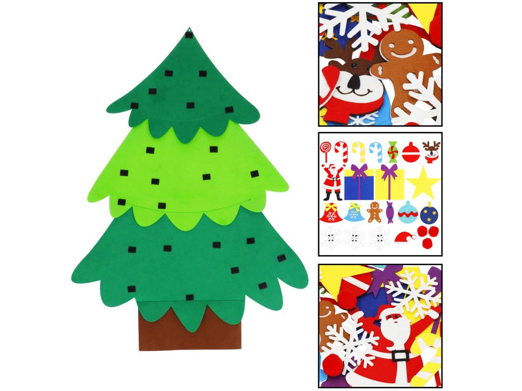 Elementi: set vsebuje filc drevo s prišitimi ježki, na katere se pritrdijo manjši filc okraski; med njimi so: lizike, darila, snežinke, rdeče kroglice, zvončki, Miklavž, kapa Miklavža, jelenova glava, kroglice, sladkarije, zvezda, figura iz medenjakov