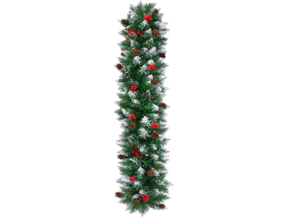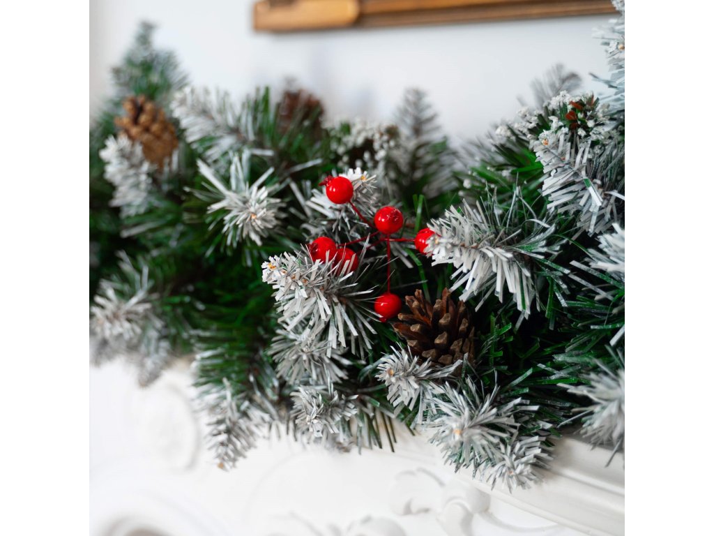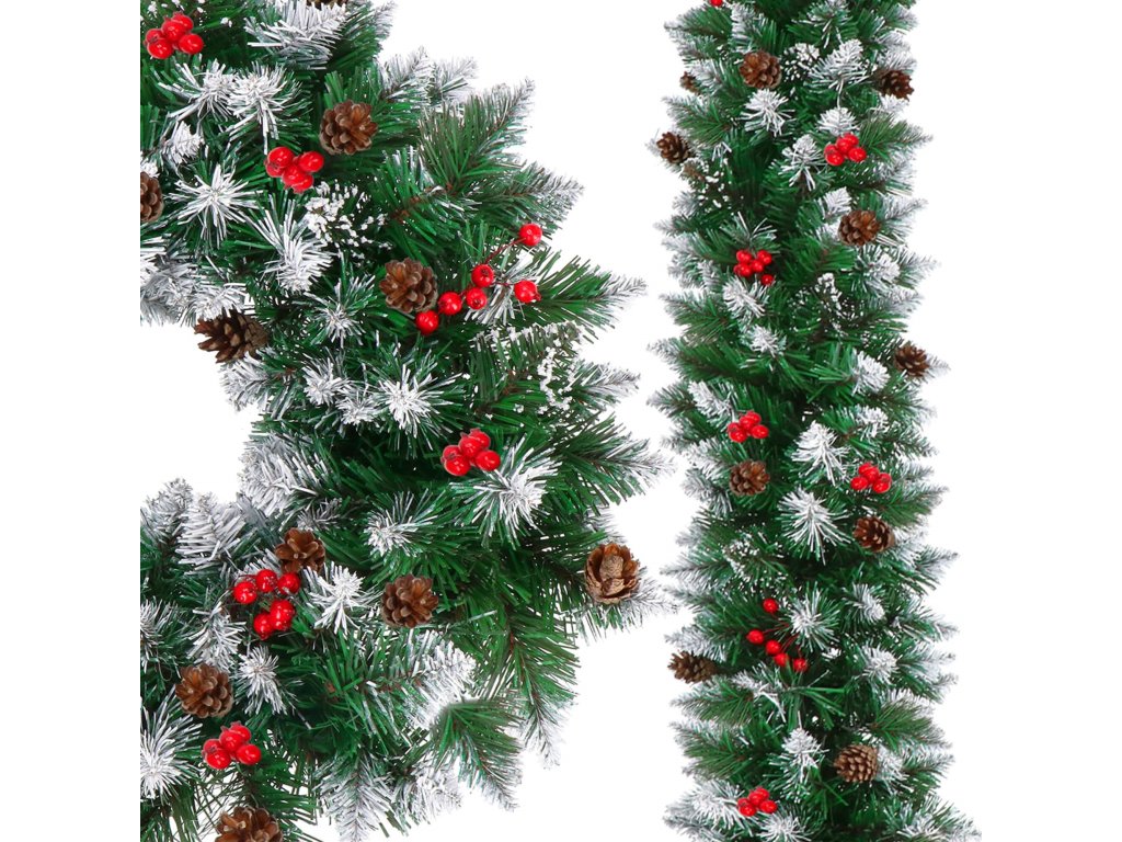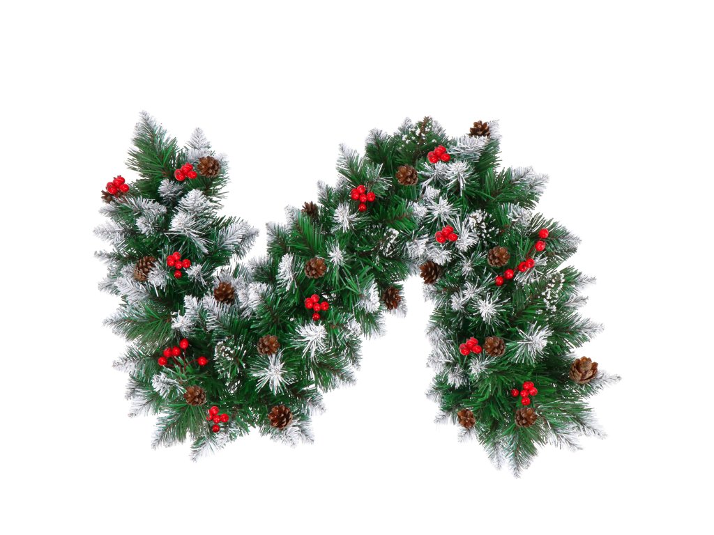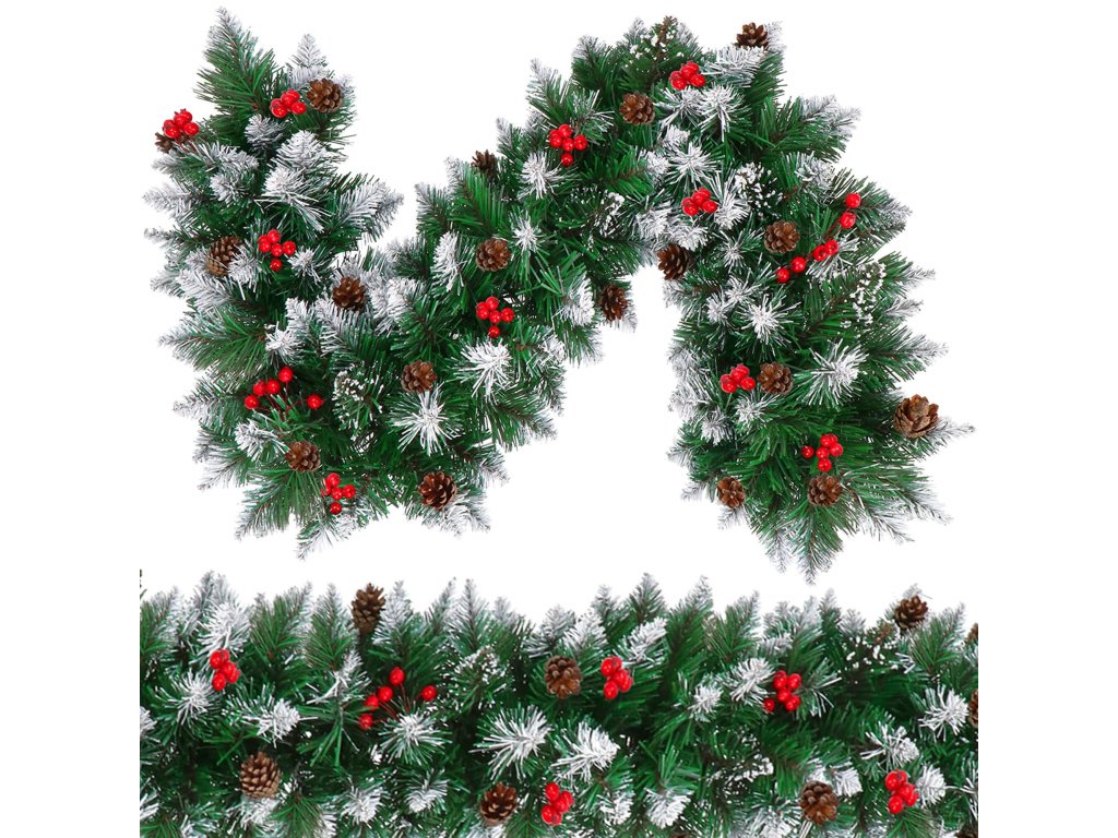 - Girlanda ima umetne iglaste vejice s PVC iglami in okraske: naravne storže in umetne jagode