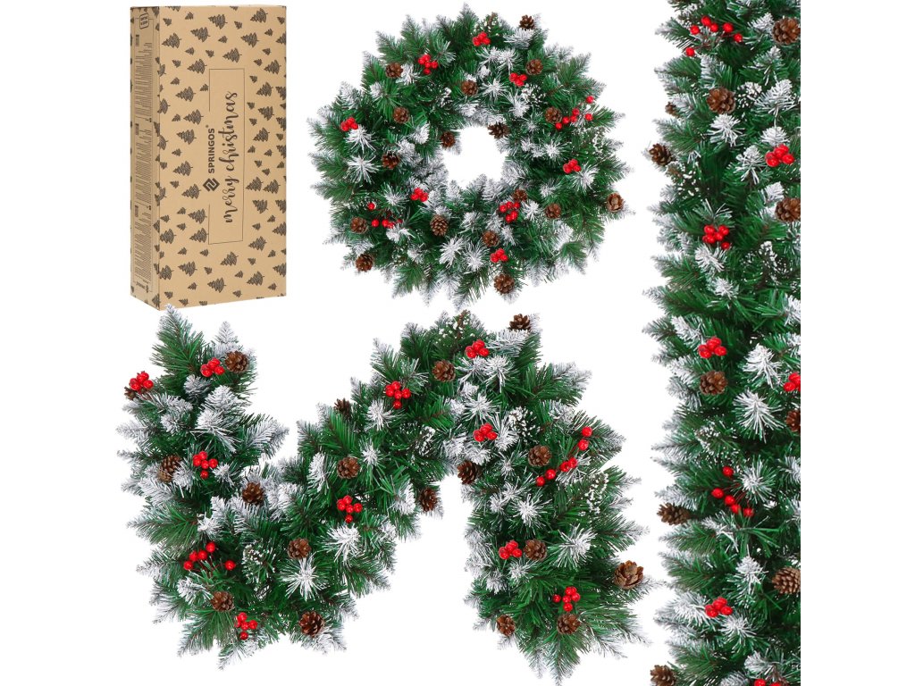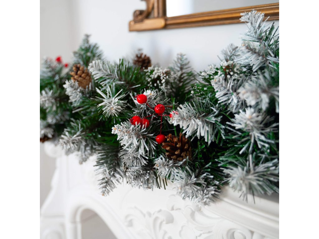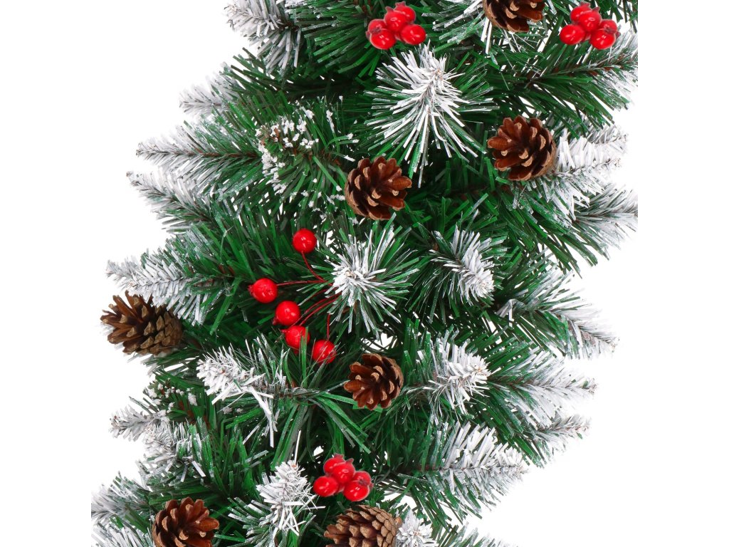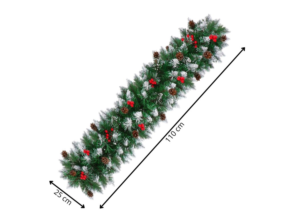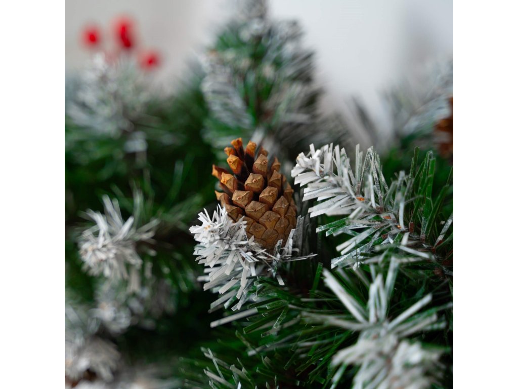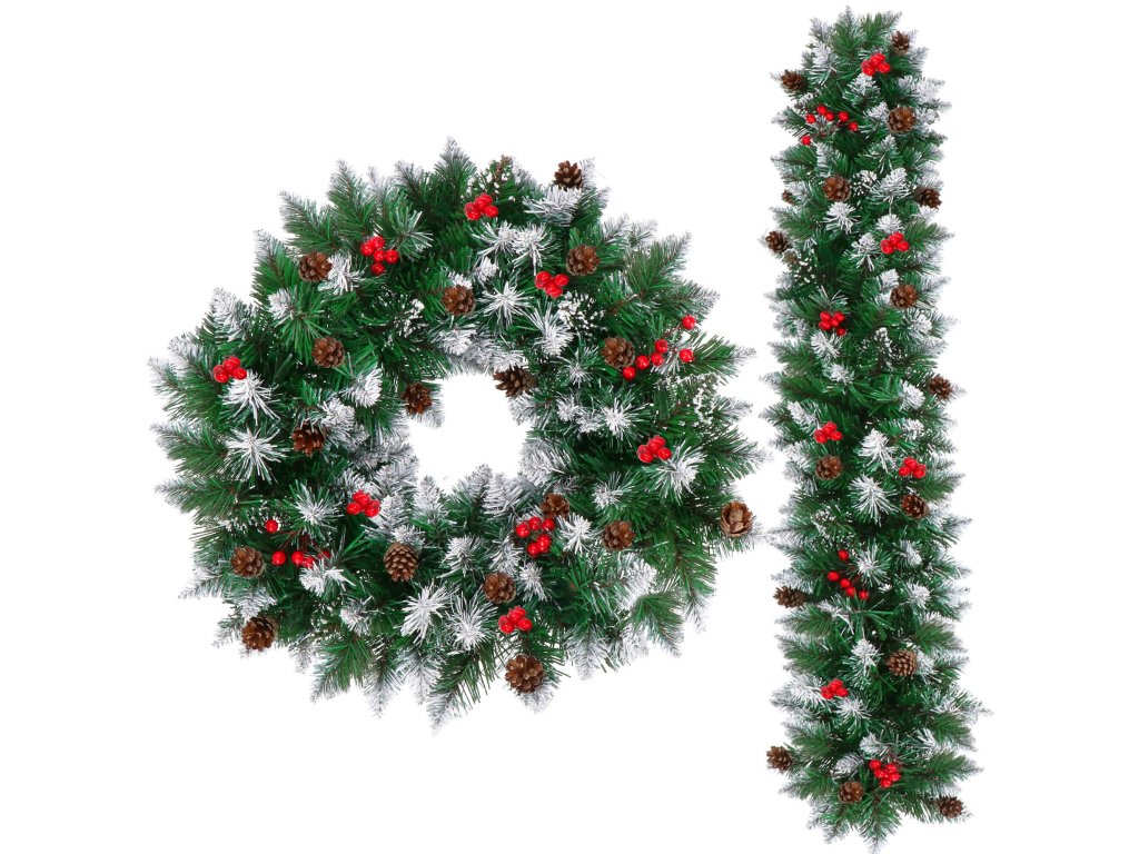 - Girlanda ima umetne iglaste vejice s PVC iglami in okraske: naravne storže in umetne jagode