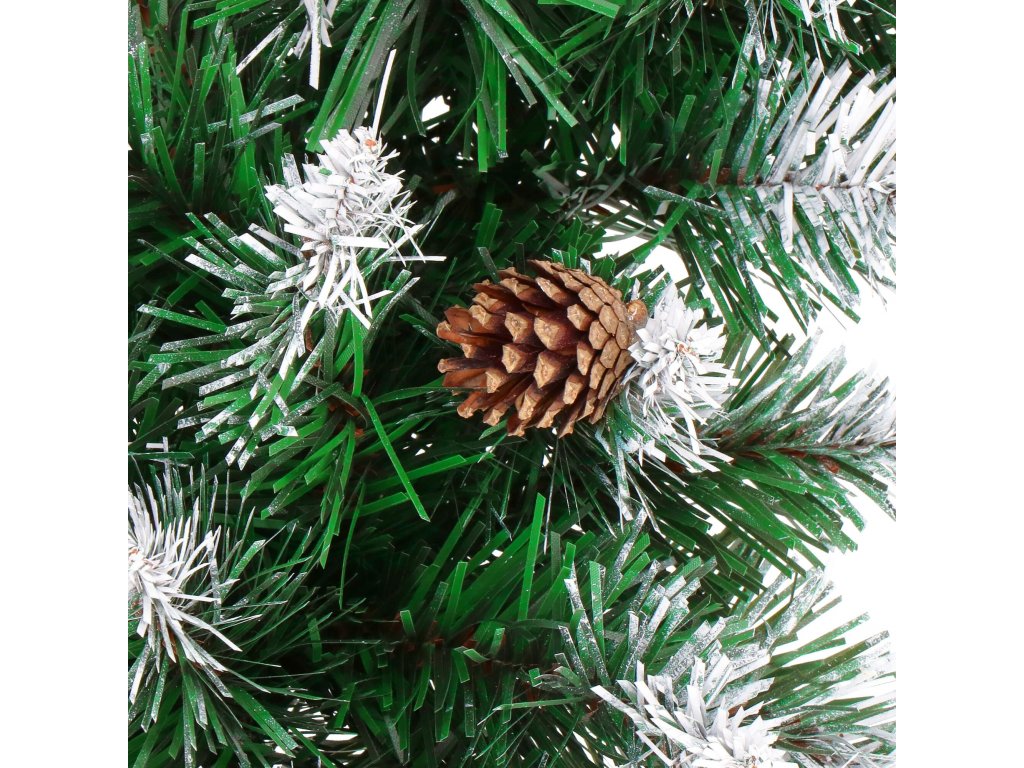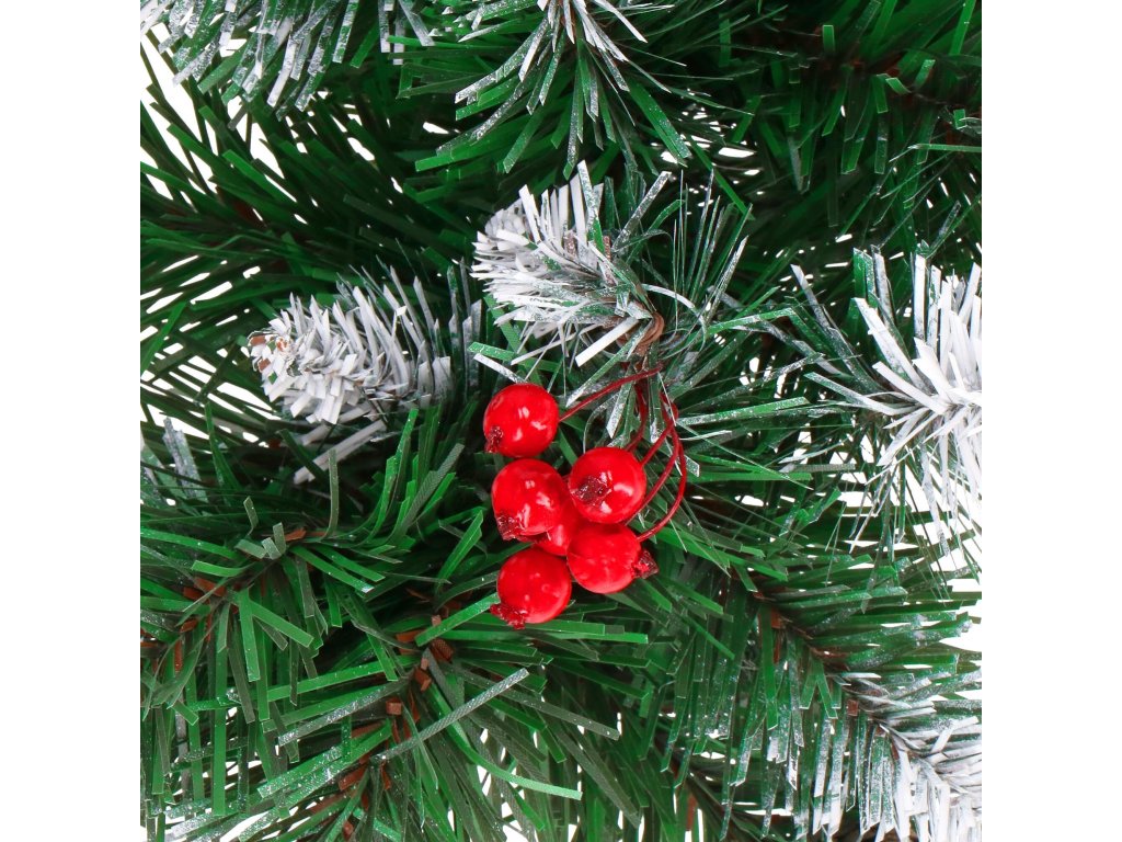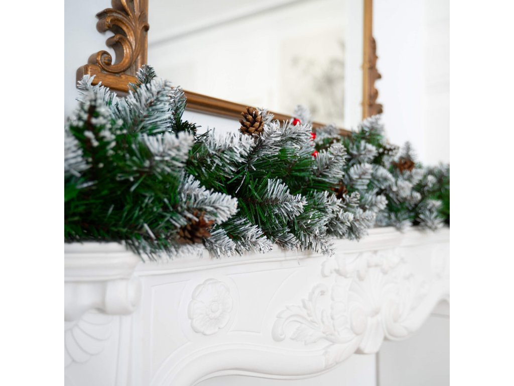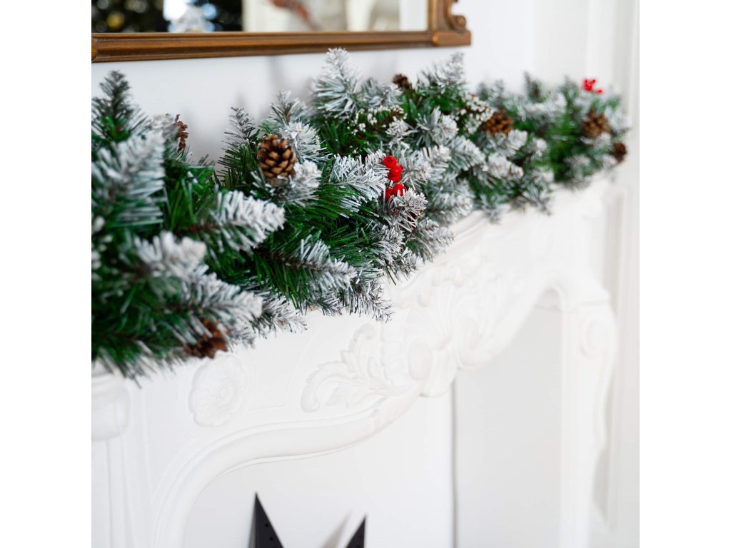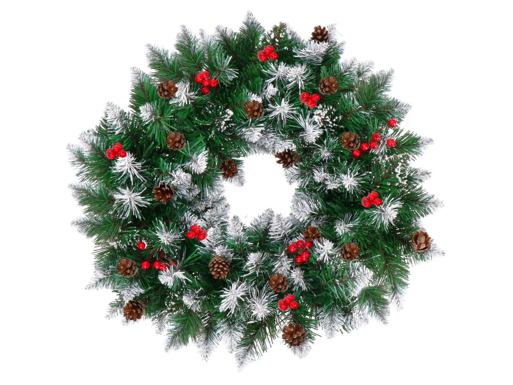 - Girlanda ima umetne iglaste vejice s PVC iglami in okraske: naravne storže in umetne jagode
