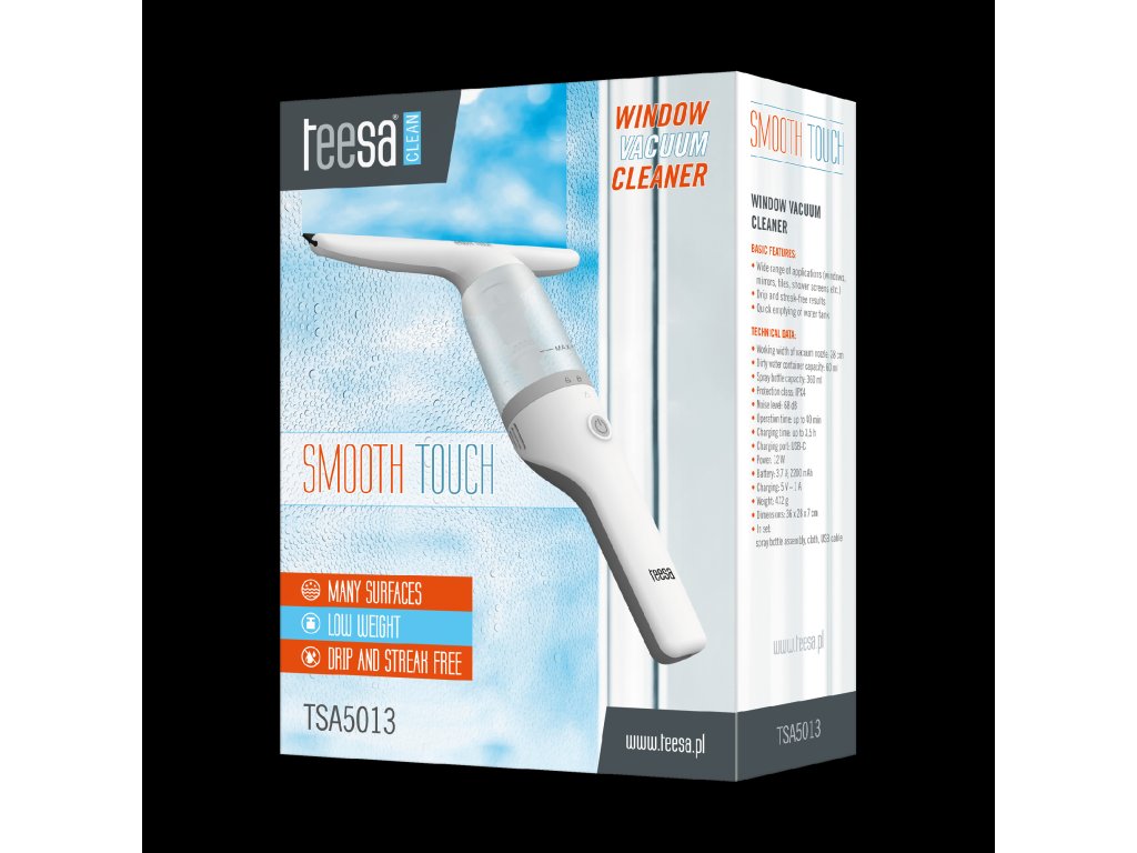 Čistilec oken TEESA SMOOTH TOUCH je nepogrešljiva naprava za ohranjanje čistoče doma in zunaj njega. Zaradi svoje vsestranskosti olajša ohranjanje različnih površin v brezhibni čistoči. Ne le, da učinkovito čisti okna, ampak tudi stekla v avtomobilu, ogledala, ploščice, tuš kabine in druge gladke površine.