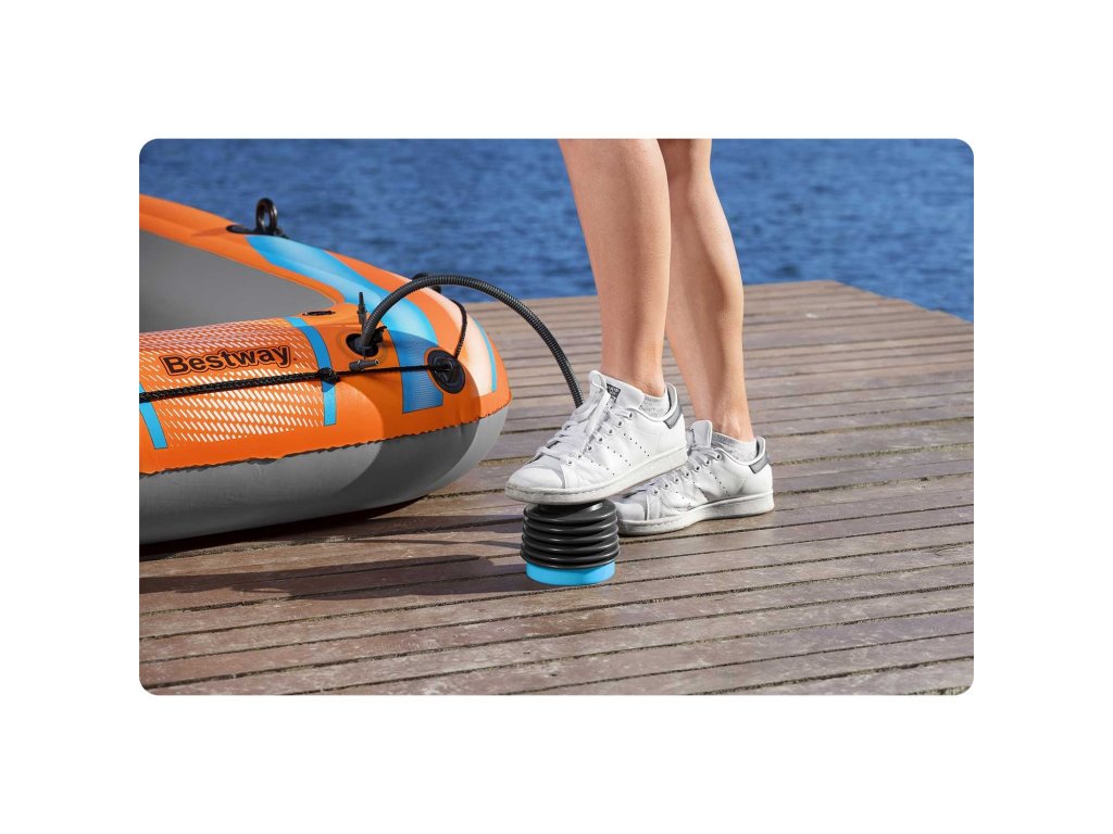 K čolnu je priložena nožna tlačilka s tremi univerzalnimi nastavki in vesla