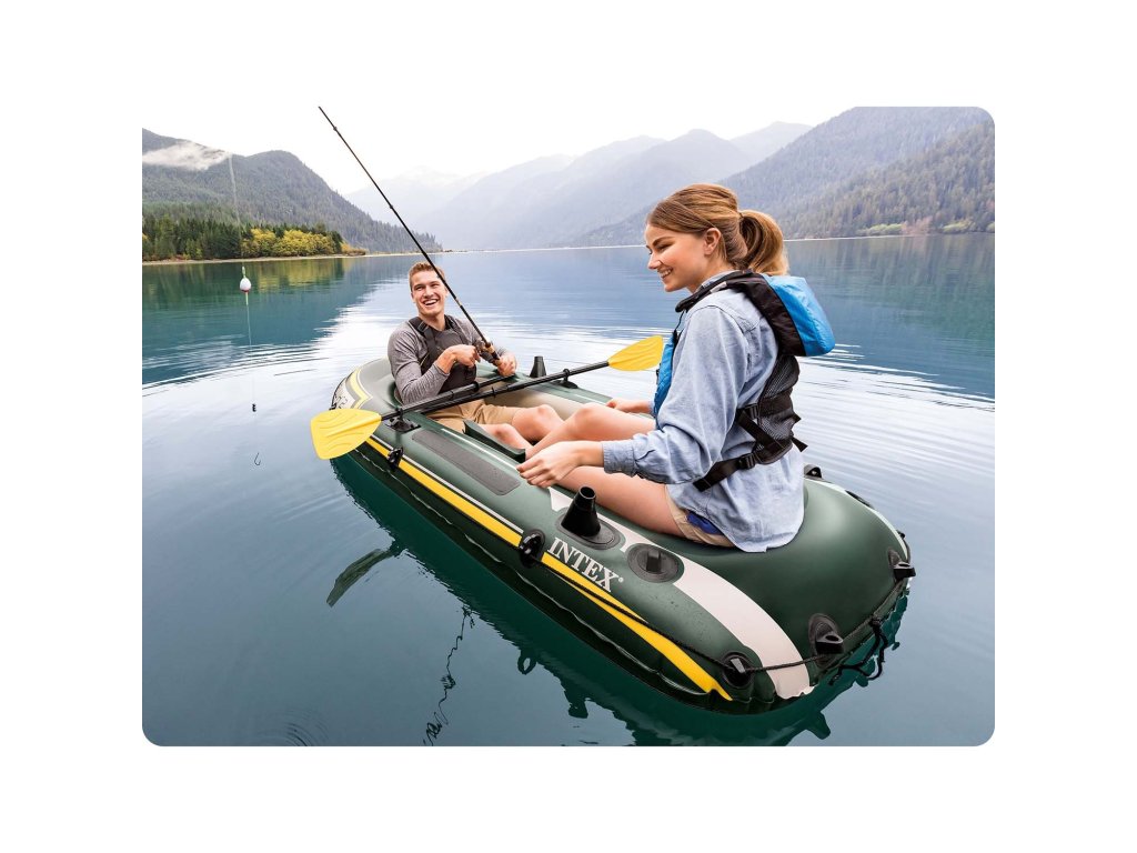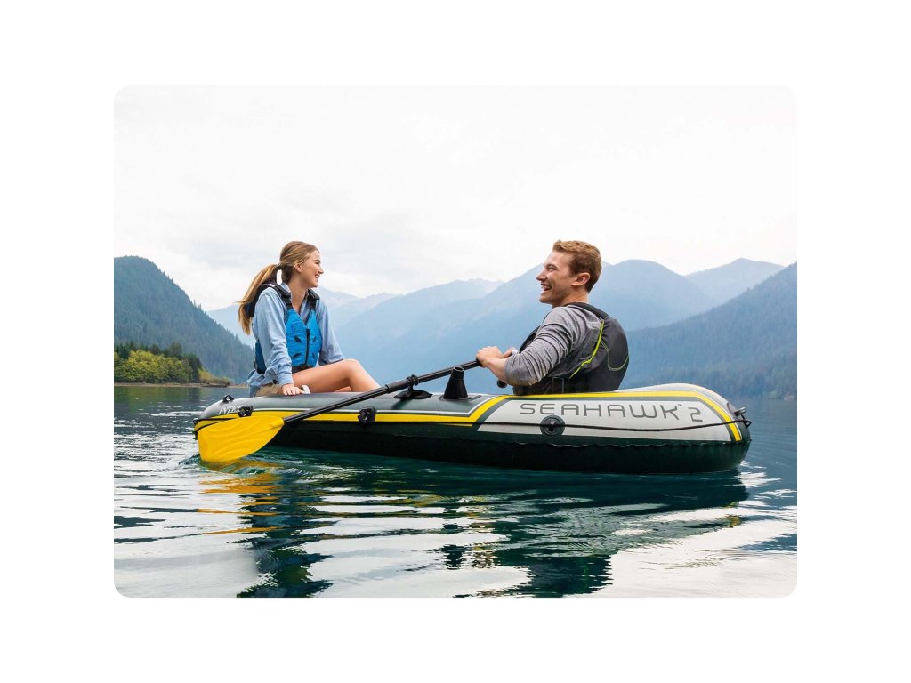 Napihljiv čoln Seahawk 2 Set priznane znamke INTEX omogoča rekreacijsko plovbo solo ali v dvoje.
