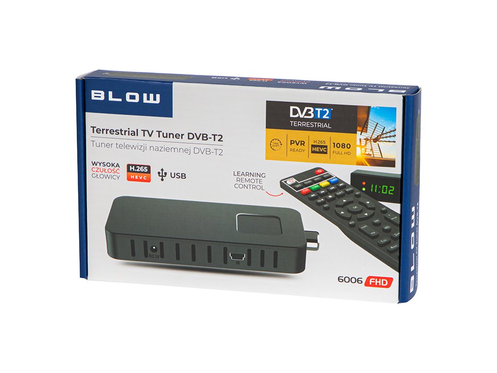 Visokokakovosten dekoder za sprejem digitalnih zemeljskih televizijskih programov BLOW DVB-T2 6006FHD mini. Naprava je opremljena s številnimi praktičnimi funkcijami in estetskim, numeričnim zaslonom.