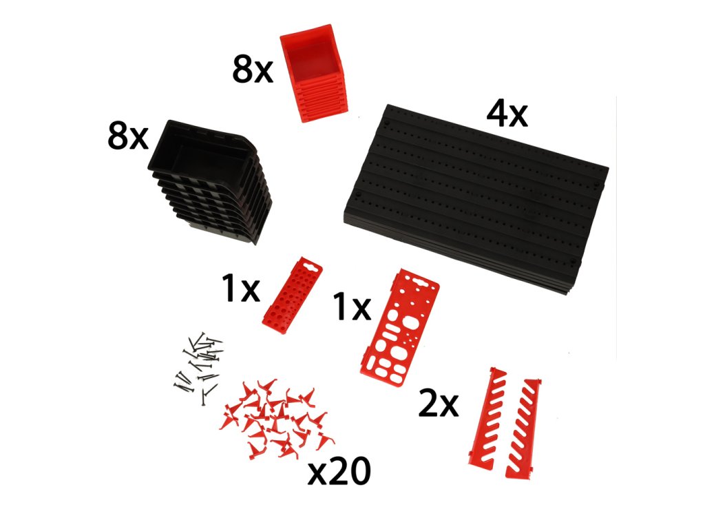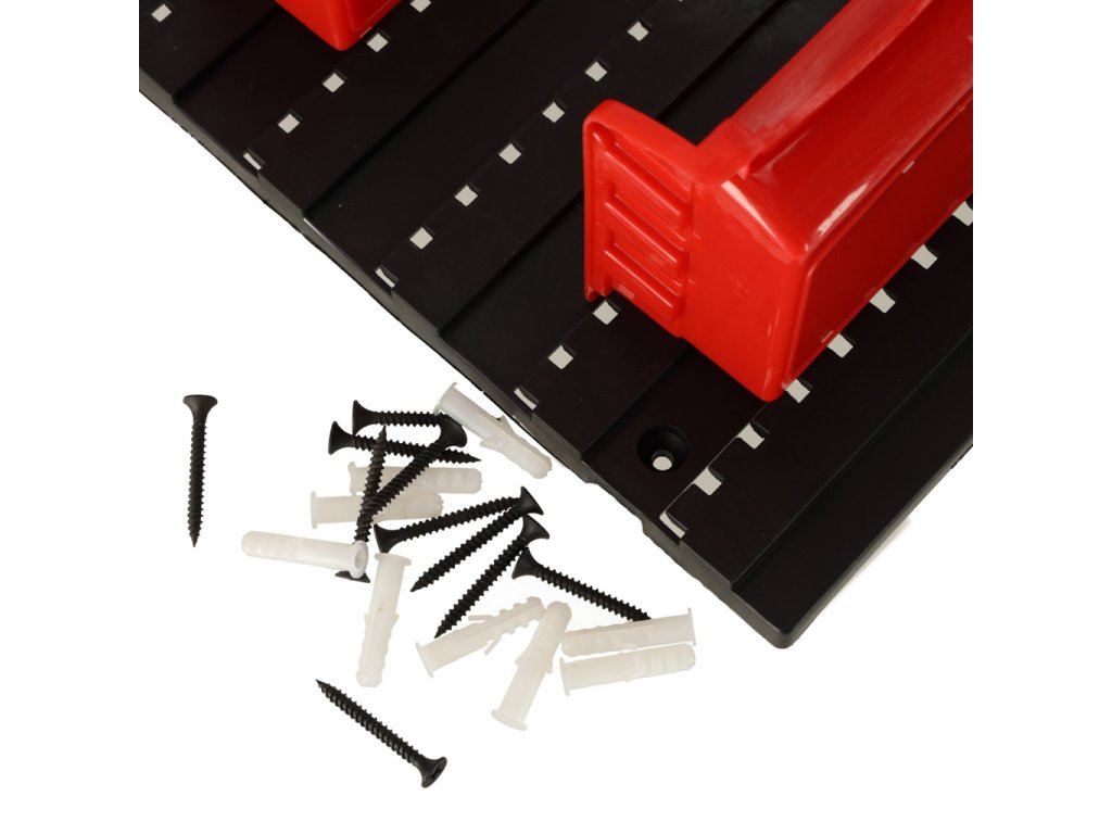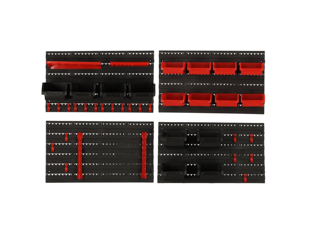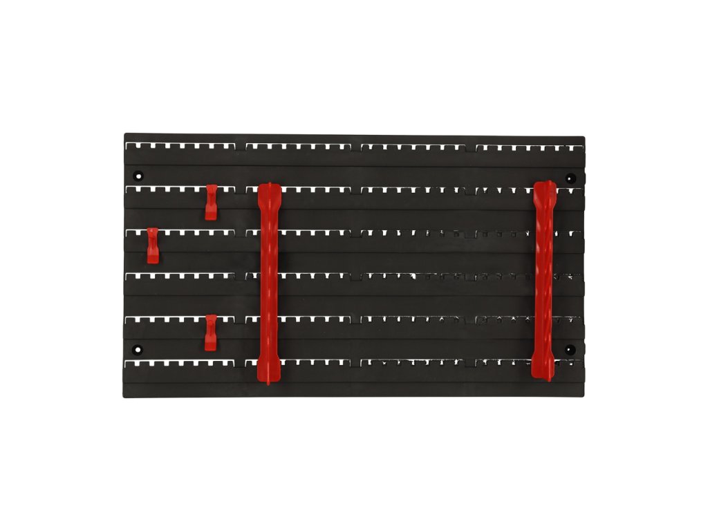 Narejen je z mislijo na organizacijo in je sestavljen iz dveh panelov in več elementov za shranjevanje orodja. Najdete lahko zabojnike za majhne predmete, police za ključe, kljukice in košare za večje orodje. Razporeditev elementov lahko prilagodite svojim potrebam zaradi posebne konstrukcije, ki omogoča obešanje polic in zabojnikov kjerkoli. Vaše najljubše orodje boste imeli tako vedno pri roki.