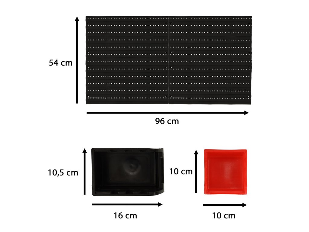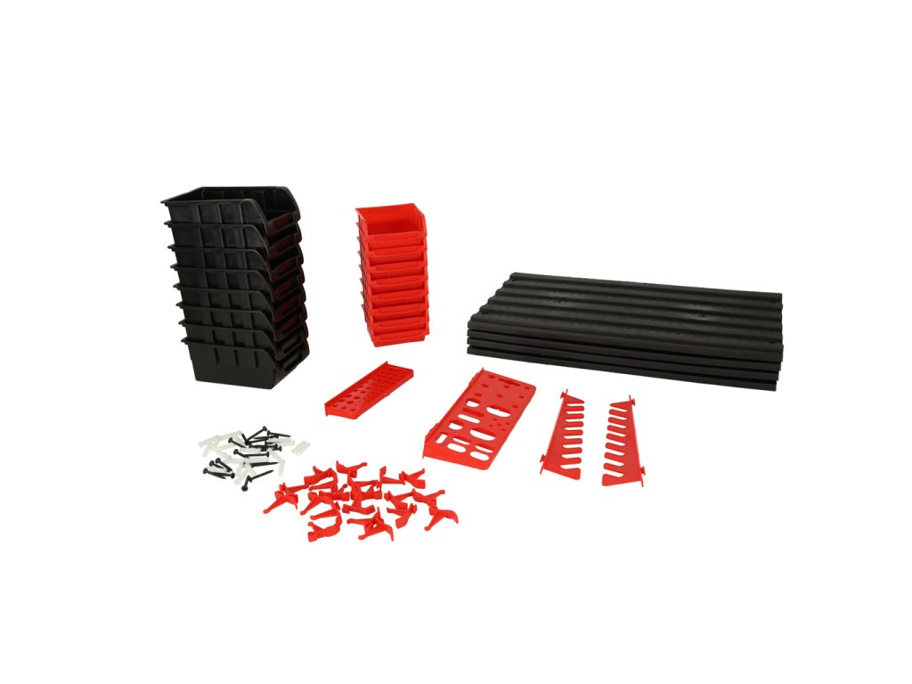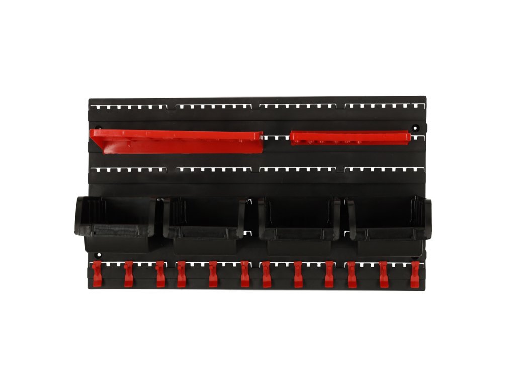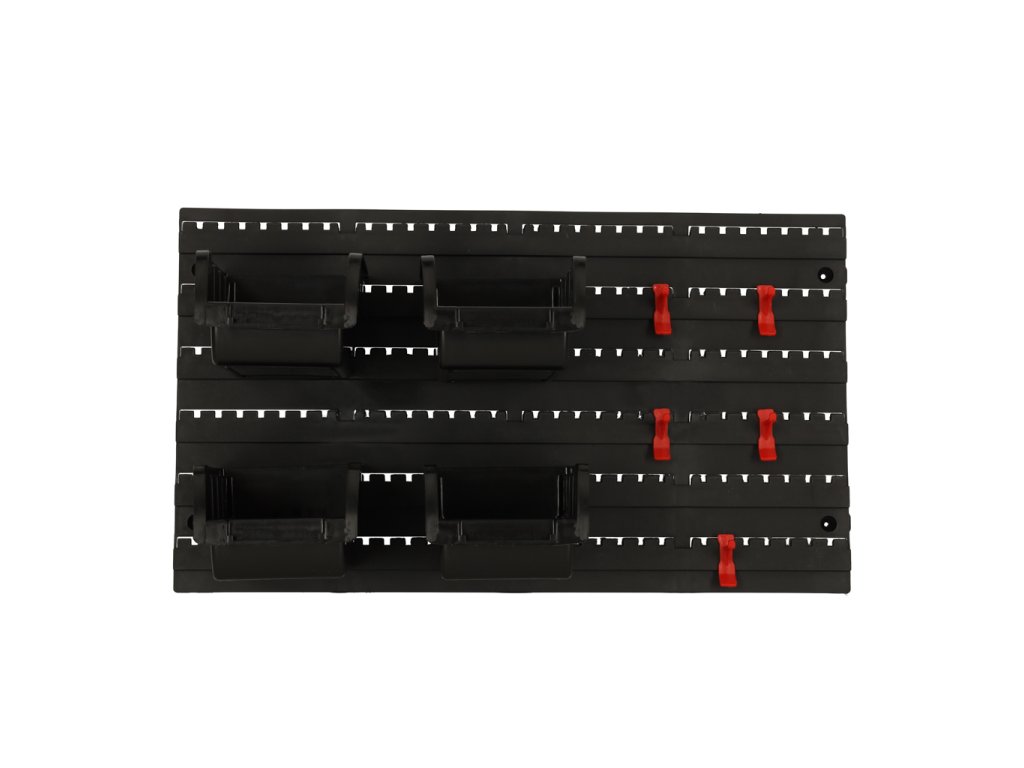 Narejen je z mislijo na organizacijo in je sestavljen iz dveh panelov in več elementov za shranjevanje orodja. Najdete lahko zabojnike za majhne predmete, police za ključe, kljukice in košare za večje orodje. Razporeditev elementov lahko prilagodite svojim potrebam zaradi posebne konstrukcije, ki omogoča obešanje polic in zabojnikov kjerkoli. Vaše najljubše orodje boste imeli tako vedno pri roki.