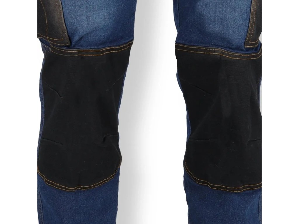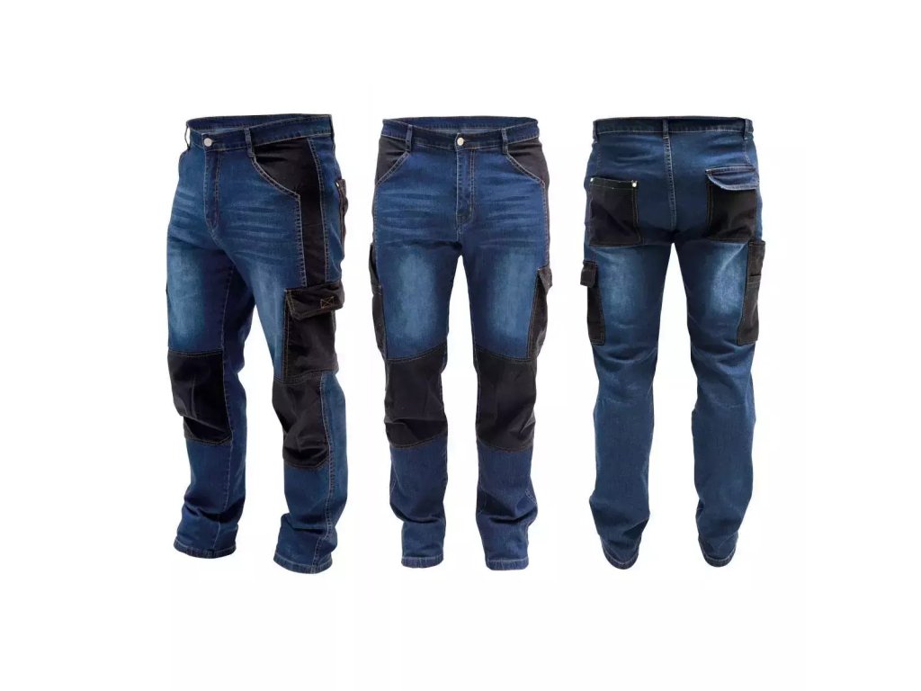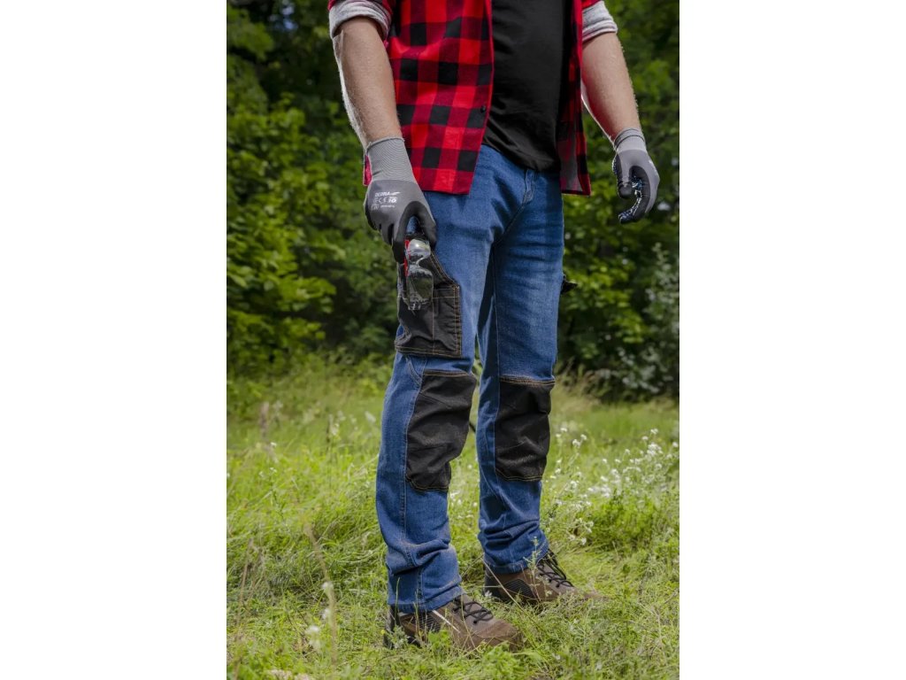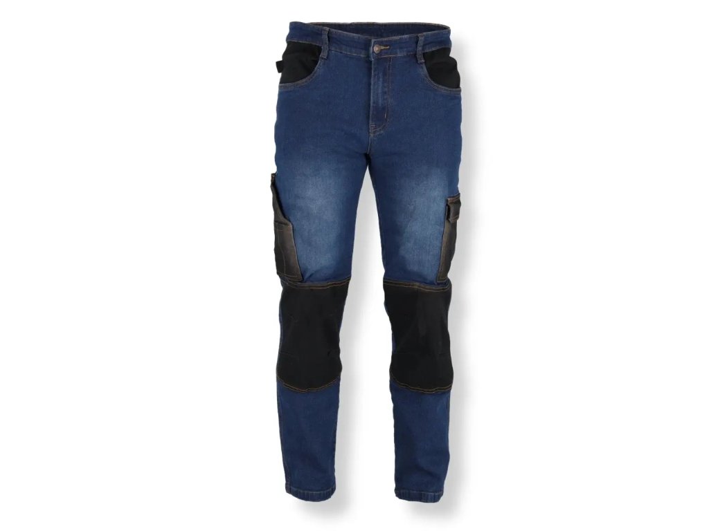 Dolge hlače iz džinsa so izdelane iz mešanice bombaža, poliestra in elastana. Material z gram težo 280 g/m2 zagotavlja dobro kroženje zraka in svobodo gibanja. Ojačitev na kolenih preprečuje trganje in obrabo, tudi ko se oblačilo pogosto uporablja pod oporo. Podaljšan pas izboljša prileganje in poveča udobje pri nošenju. Hlače imajo funkcionalne žepe, od katerih se dva zapenjata z ježkom. Hlače so idealne za uporabo na vrtu, pri obnovitvenih delih ali v delavnici.Značilnosti: