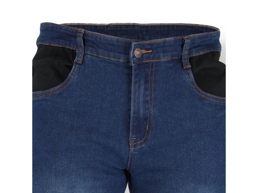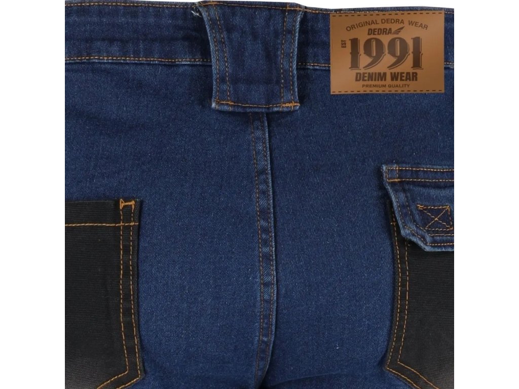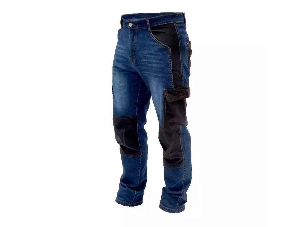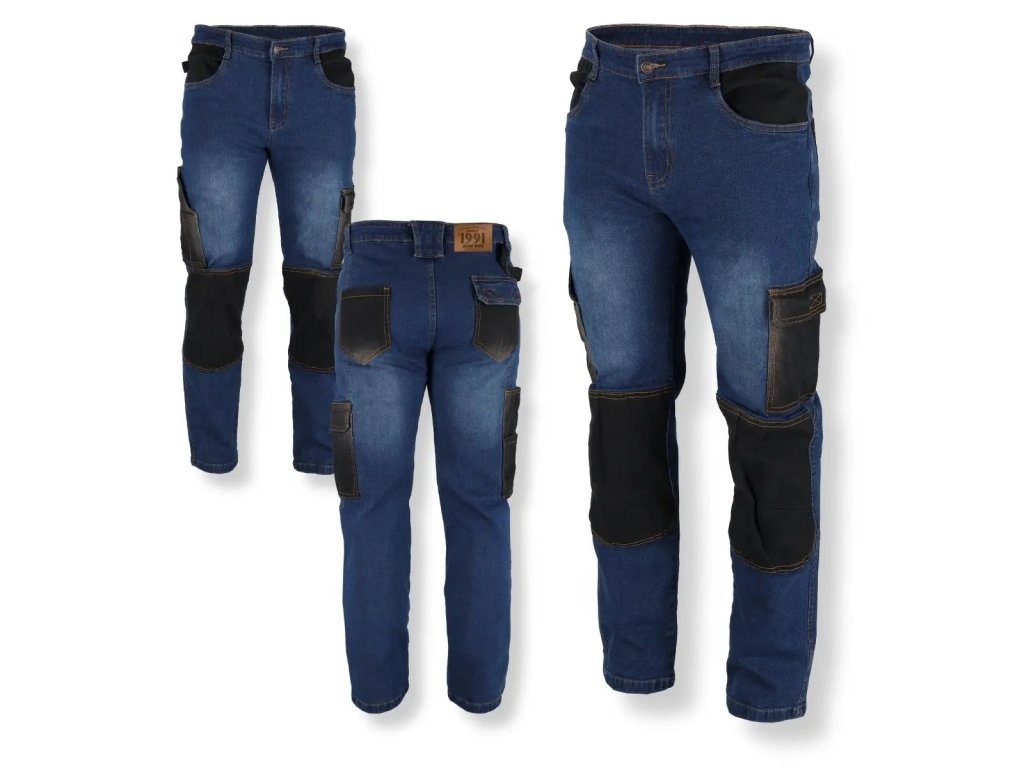 Dolge hlače iz džinsa so izdelane iz mešanice bombaža, poliestra in elastana. Material z gram težo 280 g/m2 zagotavlja dobro kroženje zraka in svobodo gibanja. Ojačitev na kolenih preprečuje trganje in obrabo, tudi ko se oblačilo pogosto uporablja pod oporo. Podaljšan pas izboljša prileganje in poveča udobje pri nošenju. Hlače imajo funkcionalne žepe, od katerih se dva zapenjata z ježkom. Hlače so idealne za uporabo na vrtu, pri obnovitvenih delih ali v delavnici.Značilnosti: