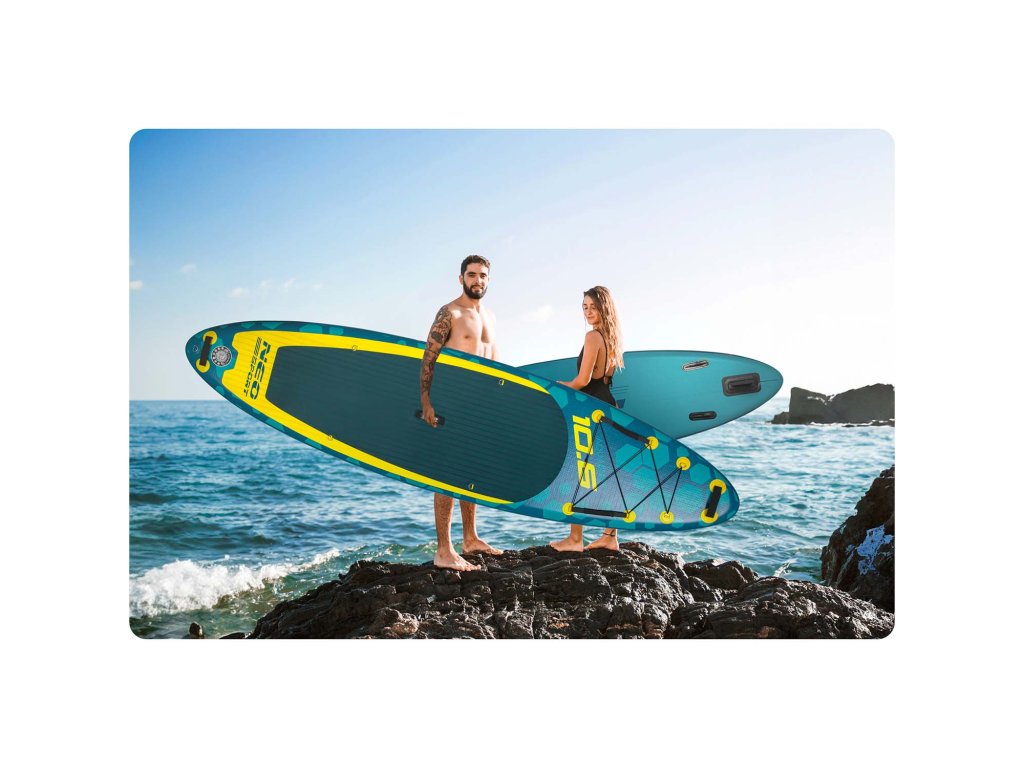 Paddleboard vrhunske kakovosti s troslojnim PVC konstrukcijo, vgrajeno železnico iz ogljikovih vlaken in ojačanimi šivi.