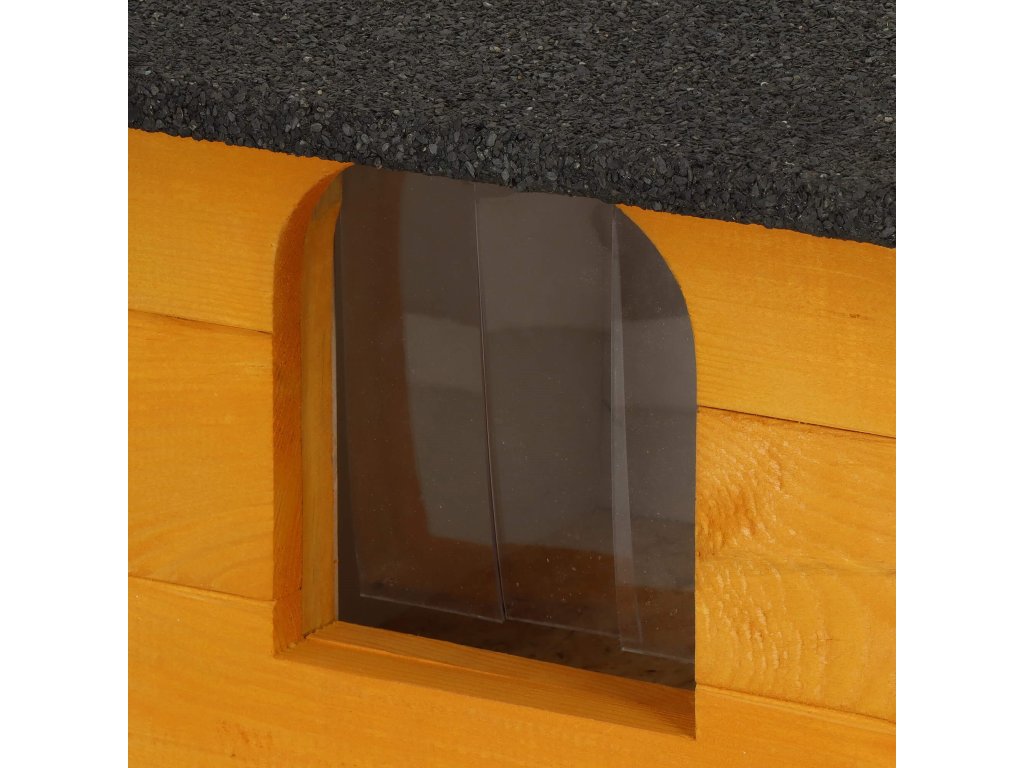 - Pri vhodu v hiško je pritrjena prozorna zavesa, ki ohranja toploto v hiški.