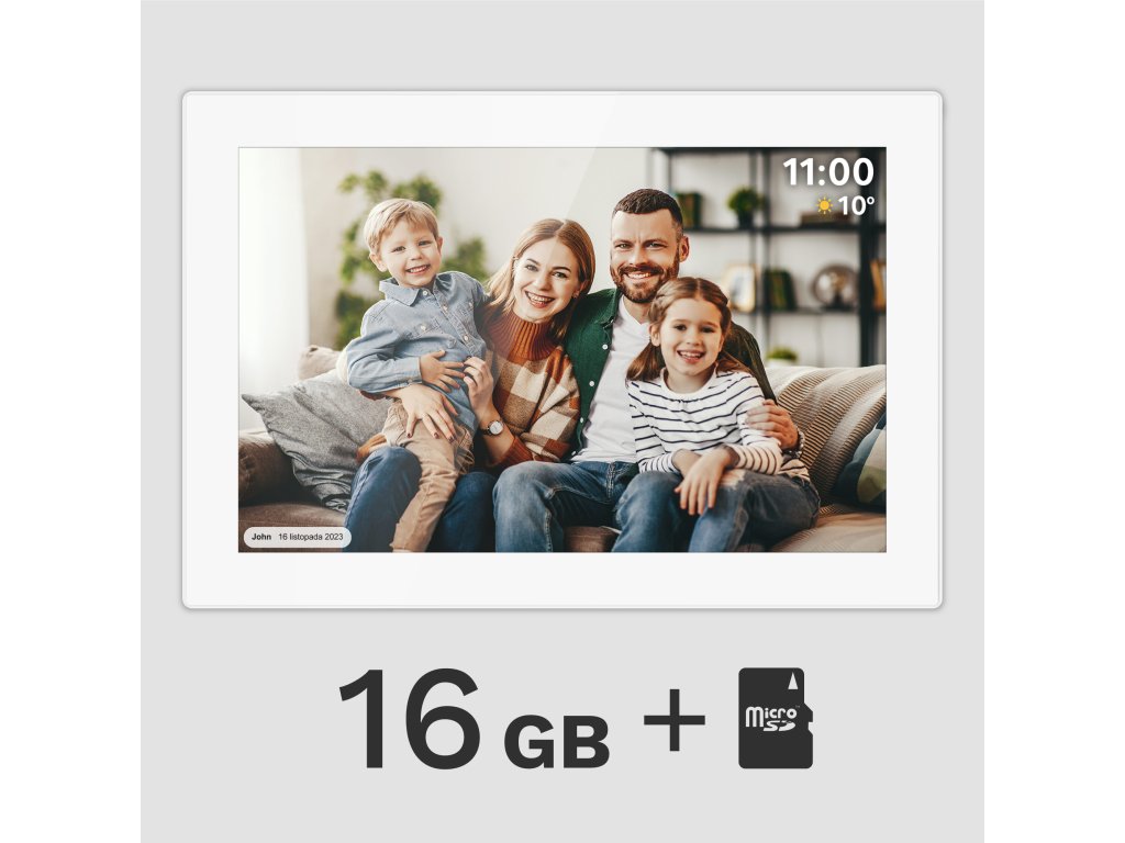 Digitalni foto okvir Kruger&Matz ima 16 GB notranjega pomnilnika za vaše multimedijske vsebine. Poleg tega je opremljen z režo za pomnilniško kartico, ki bo ta prostor povečala za dodatne 32 GB! To zadostuje za shranjevanje stotin ujetih spominov.