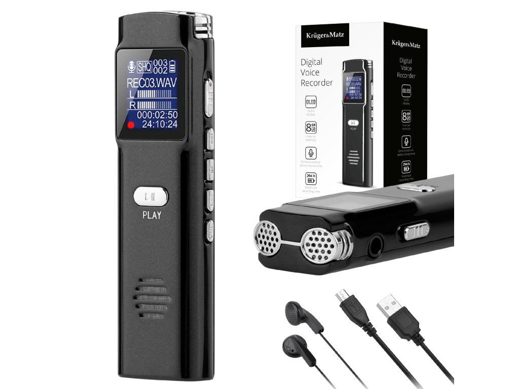 Majhen, lahek, priročen - brez težav se prilega v majhno torbico ali žep. Takšen jedigitalni diktafon Kruger&Matz KM0286 z osvetljenim OLED zaslonom. Naprava je opremljena zstereofonskim, večsmernim mikrofonom, ki vam omogoča snemanje v visoki kakovosti tako med poslovnimi srečanji v majhni konferenčni sobi kot med predavanji v veliki univerzitetni avli.