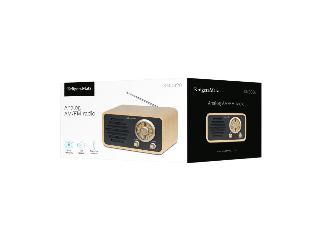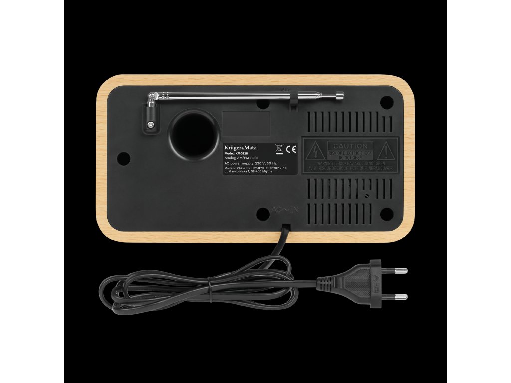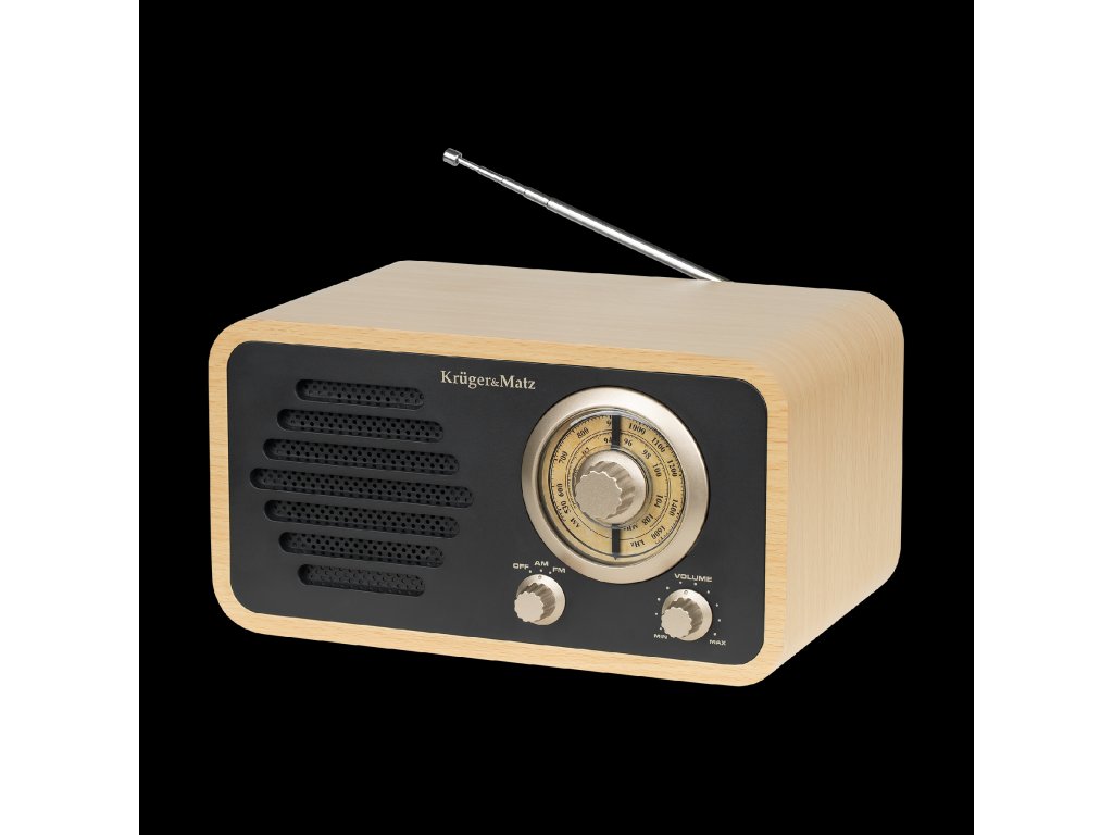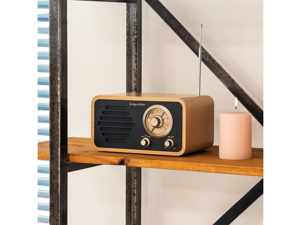 Radio Kruger&Matz očara s svojim edinstvenim stilom. Lesena škatla v kombinaciji s črno prednjo ploščo in zlatimi gumbi ustvarja eleganten, retro videz. Ta dizajn se popolnoma prilega klasičnim in modernim interjerjem in postane njihova edinstvena dekoracija.